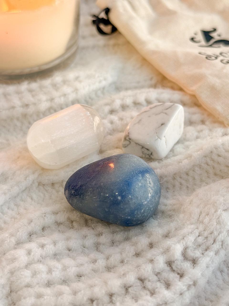 Quartzo Azul: Com sua energia calmante e relaxante, proporciona harmonia, paz interior e alivia tensões musculares auxiliando no processo de entrar em sono profundo e reparador.