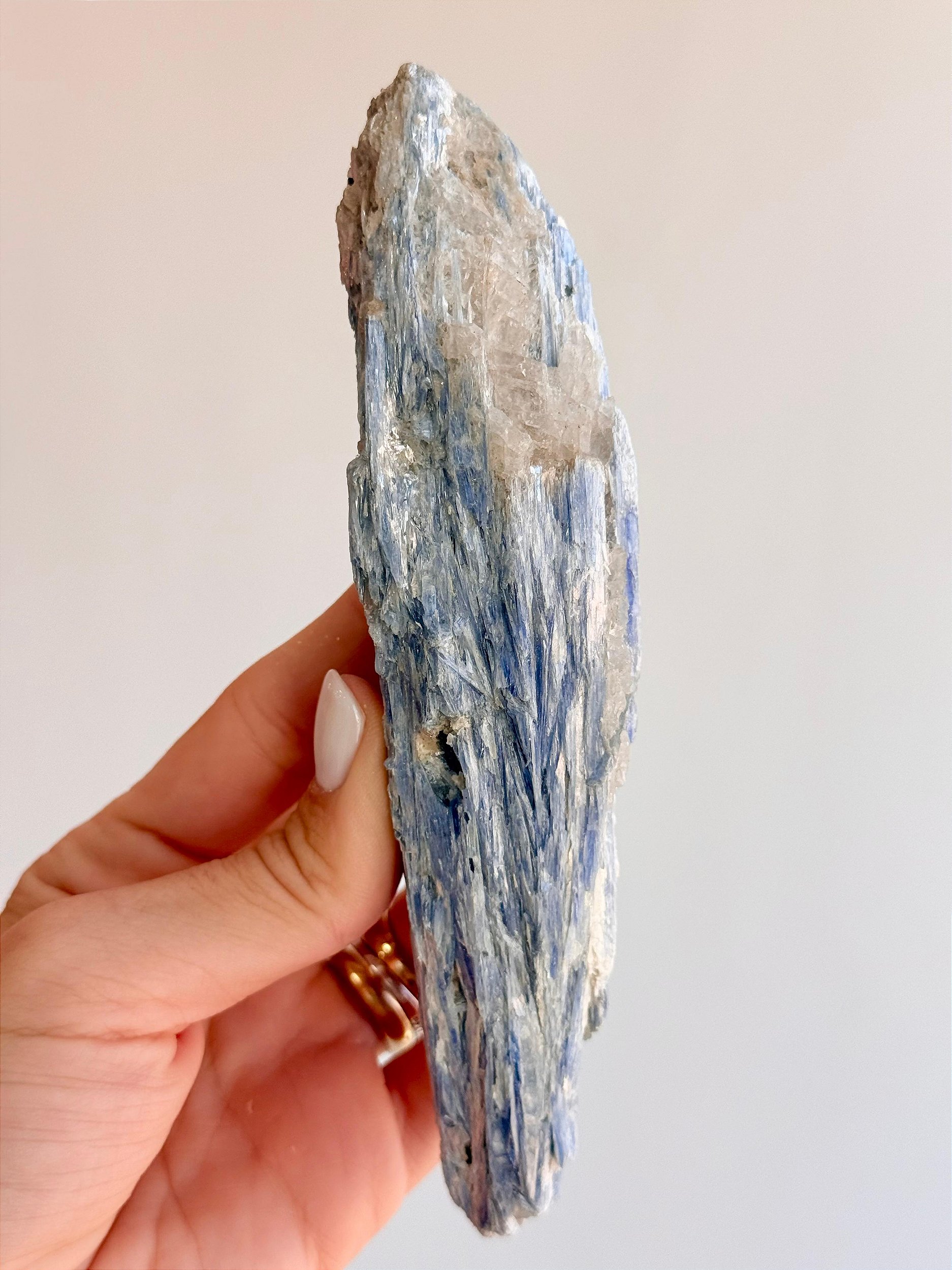 ⭐ Descrição Física: Apresenta tonalidades que variam do azul-claro ao azul profundo, com reflexos que lembram a luz passando por lâminas de cristal. Sua estrutura é naturalmente alongada e estriada, formando lâminas ou filetes delicados Cada peça é única, podendo variar em tonalidade, brilho, formato e tamanho. Podem ocorrer veios, áreas mais opacas ou irregulares, características naturais da formação da pedra.
