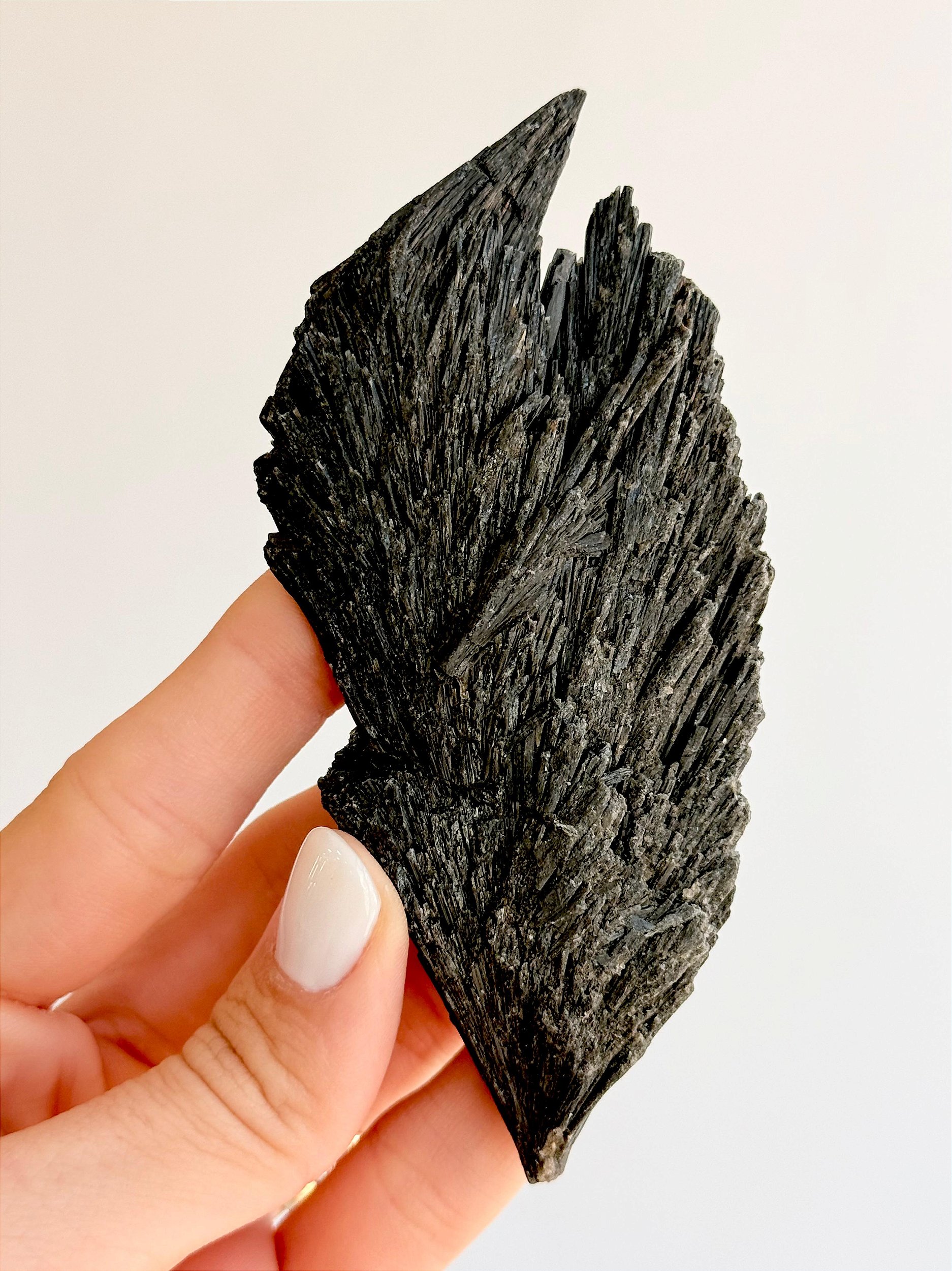 ⭐ Descrição Física: Apresenta coloração preta a cinza-escura, com brilho levemente vítreo a acetinado. Sua estrutura é formada por lâminas alongadas e estriadas, que crescem em feixes ou leques naturais, lembrando pequenas vassouras ou leques cristalinos, reforçando seu simbolismo de limpeza energética. Cada peça é única, podendo variar em tonalidade, brilho, formato e tamanho. Podem ocorrer veios, áreas mais opacas ou irregulares, características naturais da formação da pedra.
