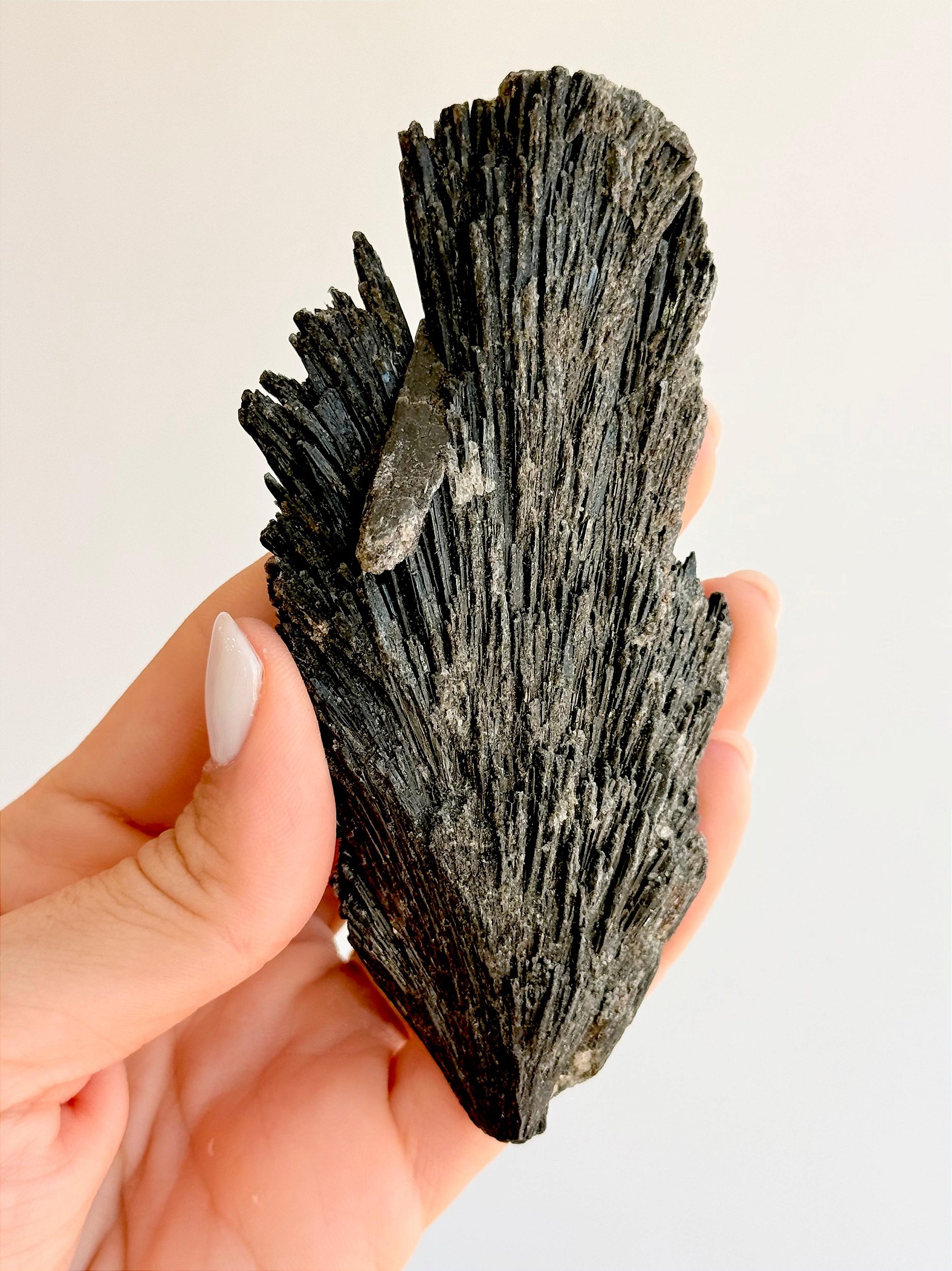 ⭐ Descrição Física: Apresenta coloração preta a cinza-escura, com brilho levemente vítreo a acetinado. Sua estrutura é formada por lâminas alongadas e estriadas, que crescem em feixes ou leques naturais, lembrando pequenas vassouras ou leques cristalinos, reforçando seu simbolismo de limpeza energética. Cada peça é única, podendo variar em tonalidade, brilho, formato e tamanho. Podem ocorrer veios, áreas mais opacas ou irregulares, características naturais da formação da pedra.