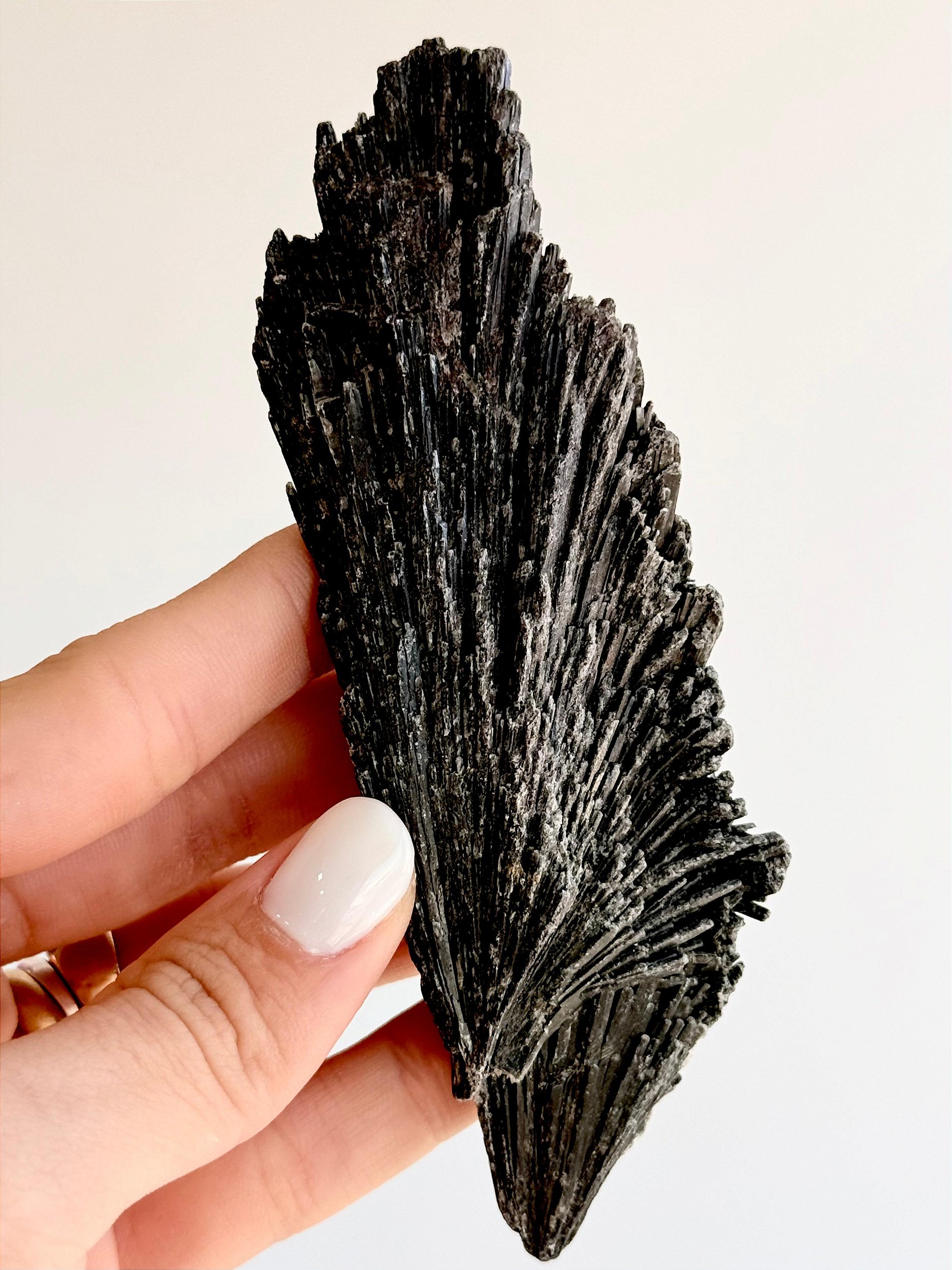 ⭐ Descrição Física: Apresenta coloração preta a cinza-escura, com brilho levemente vítreo a acetinado. Sua estrutura é formada por lâminas alongadas e estriadas, que crescem em feixes ou leques naturais, lembrando pequenas vassouras ou leques cristalinos, reforçando seu simbolismo de limpeza energética. Cada peça é única, podendo variar em tonalidade, brilho, formato e tamanho. Podem ocorrer veios, áreas mais opacas ou irregulares, características naturais da formação da pedra.