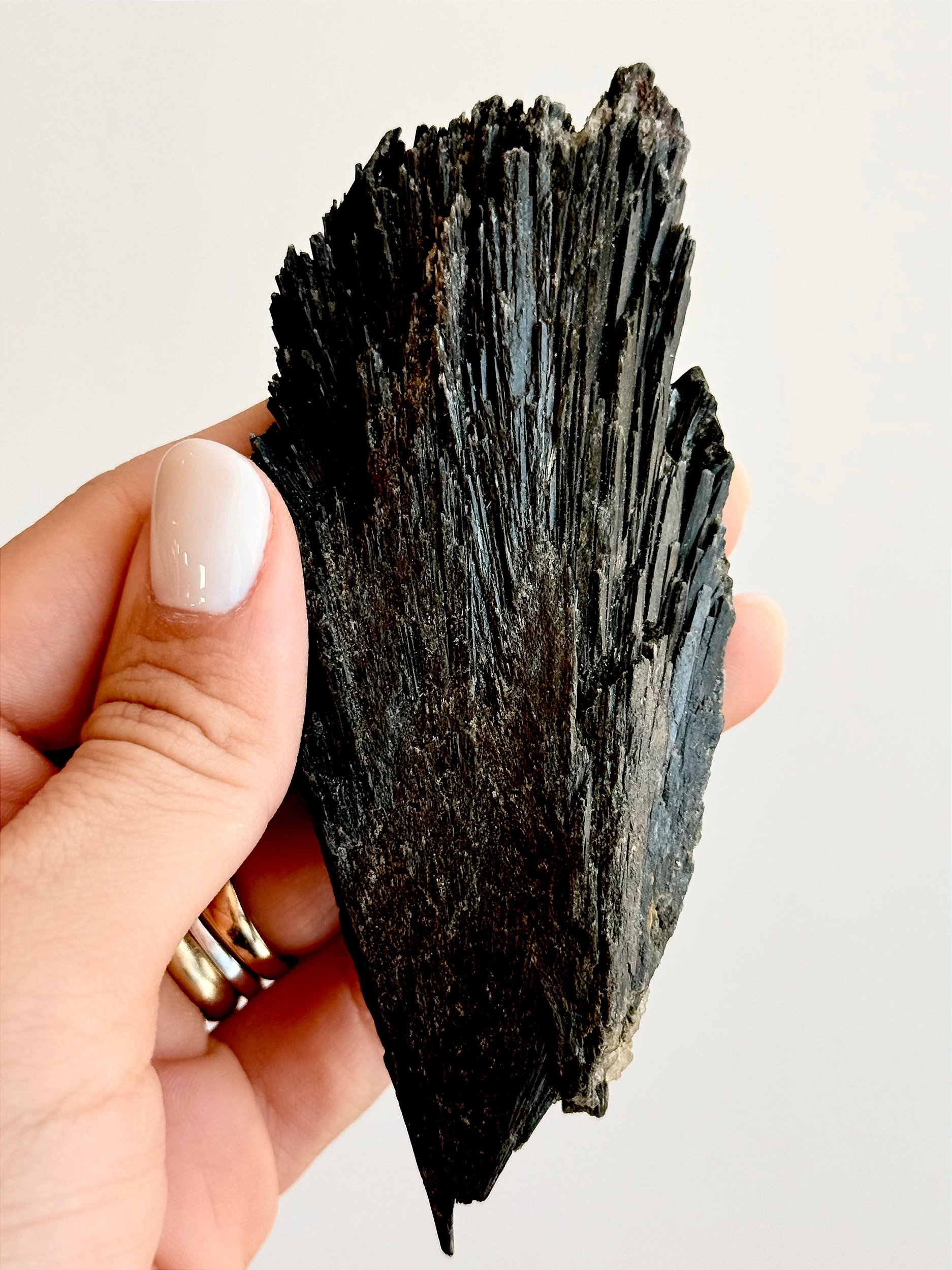 ⭐ Descrição Física: Apresenta coloração preta a cinza-escura, com brilho levemente vítreo a acetinado. Sua estrutura é formada por lâminas alongadas e estriadas, que crescem em feixes ou leques naturais, lembrando pequenas vassouras ou leques cristalinos, reforçando seu simbolismo de limpeza energética. Cada peça é única, podendo variar em tonalidade, brilho, formato e tamanho. Podem ocorrer veios, áreas mais opacas ou irregulares, características naturais da formação da pedra.