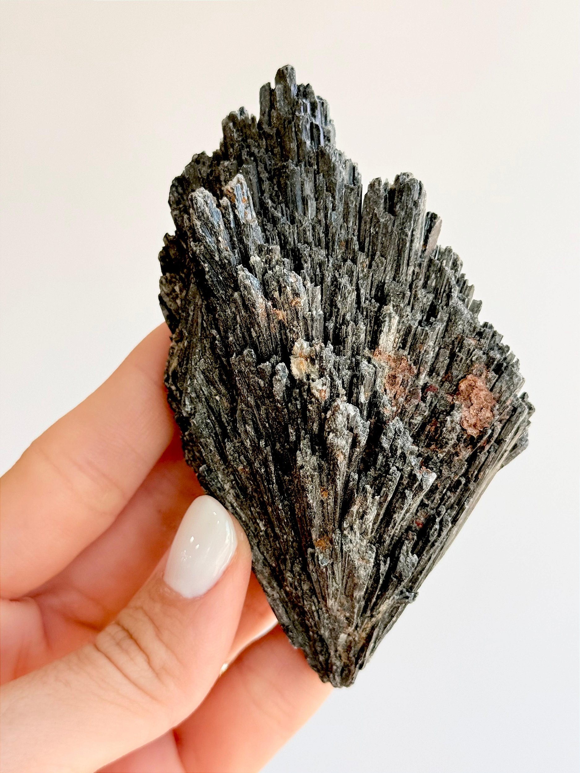 ⭐ Descrição Física: Apresenta coloração preta a cinza-escura, com brilho levemente vítreo a acetinado. Sua estrutura é formada por lâminas alongadas e estriadas, que crescem em feixes ou leques naturais, lembrando pequenas vassouras ou leques cristalinos, reforçando seu simbolismo de limpeza energética. Cada peça é única, podendo variar em tonalidade, brilho, formato e tamanho. Podem ocorrer veios, áreas mais opacas ou irregulares, características naturais da formação da pedra.