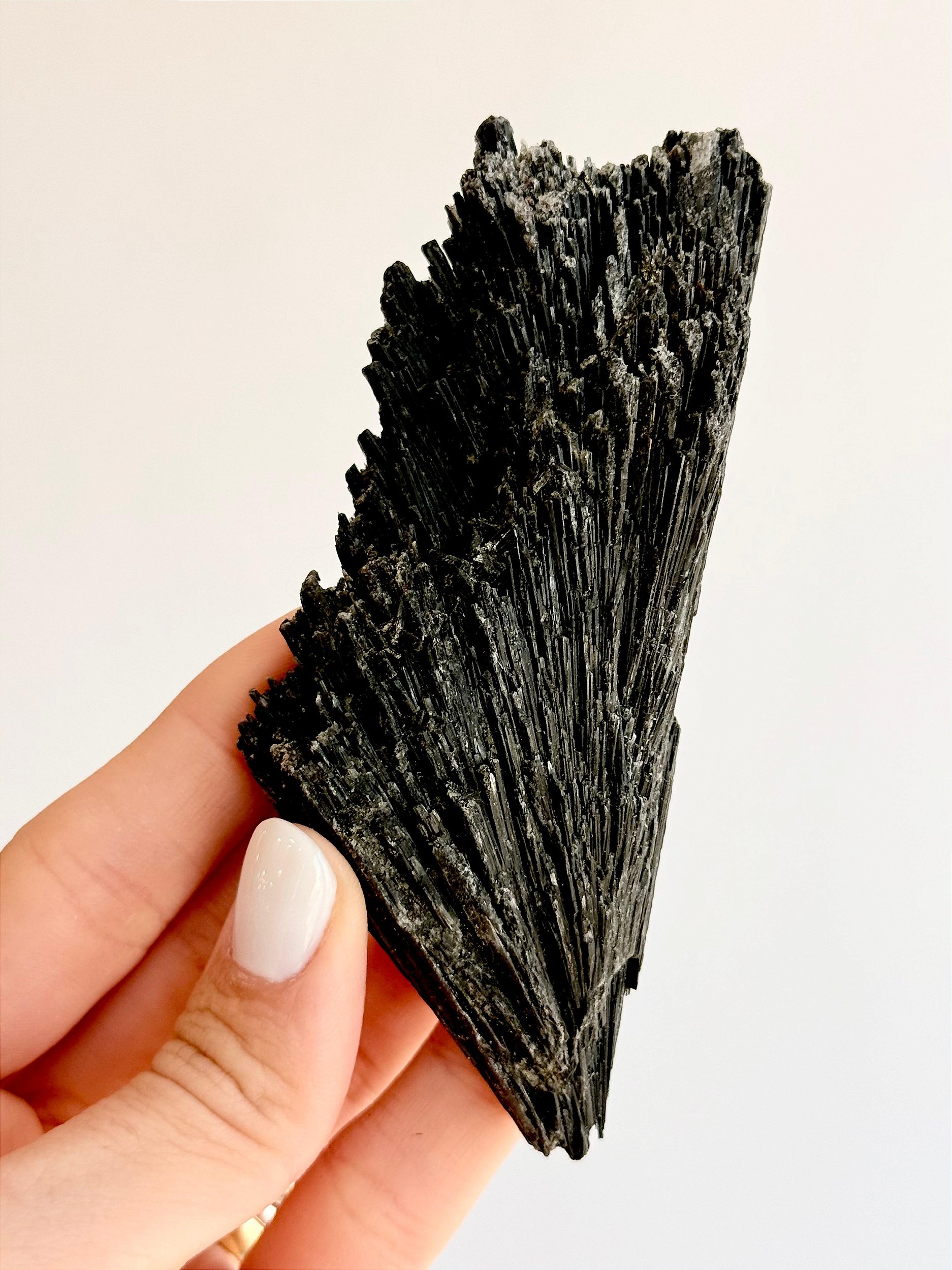 ⭐ Descrição Física: Apresenta coloração preta a cinza-escura, com brilho levemente vítreo a acetinado. Sua estrutura é formada por lâminas alongadas e estriadas, que crescem em feixes ou leques naturais, lembrando pequenas vassouras ou leques cristalinos, reforçando seu simbolismo de limpeza energética. Cada peça é única, podendo variar em tonalidade, brilho, formato e tamanho. Podem ocorrer veios, áreas mais opacas ou irregulares, características naturais da formação da pedra.
