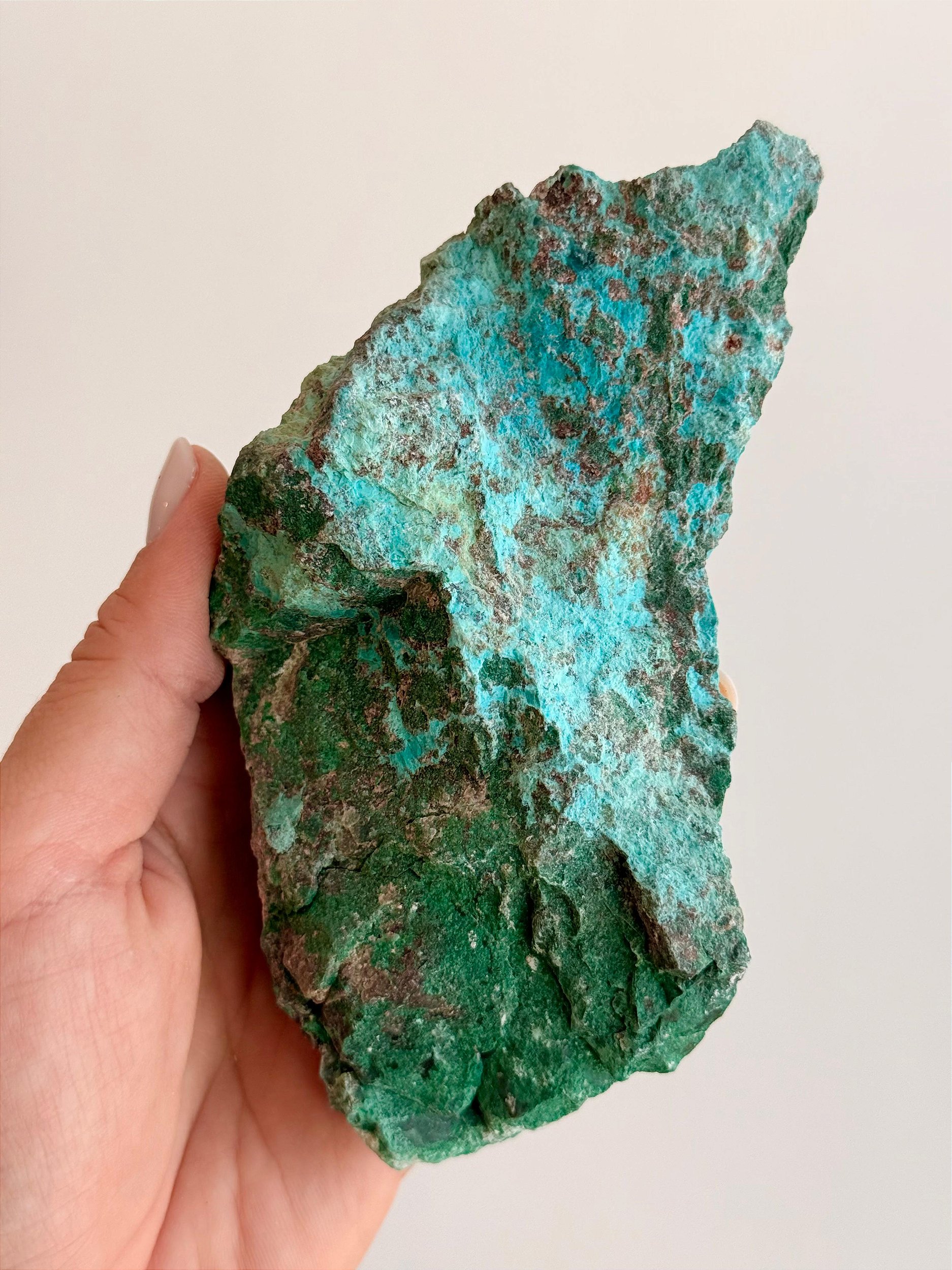 ⭐ Descrição Física: Apresenta uma combinação natural de tons azulados e verde intenso, formando padrões únicos devido à presença de Crisocola e Malaquita. Possui aspecto opaco, com superfície irregular característica da forma bruta e aparência marcante. Cada peça é única, podendo variar em tonalidade, brilho, formato e tamanho. Podem ocorrer veios, áreas mais opacas ou irregulares, características naturais da formação da pedra.