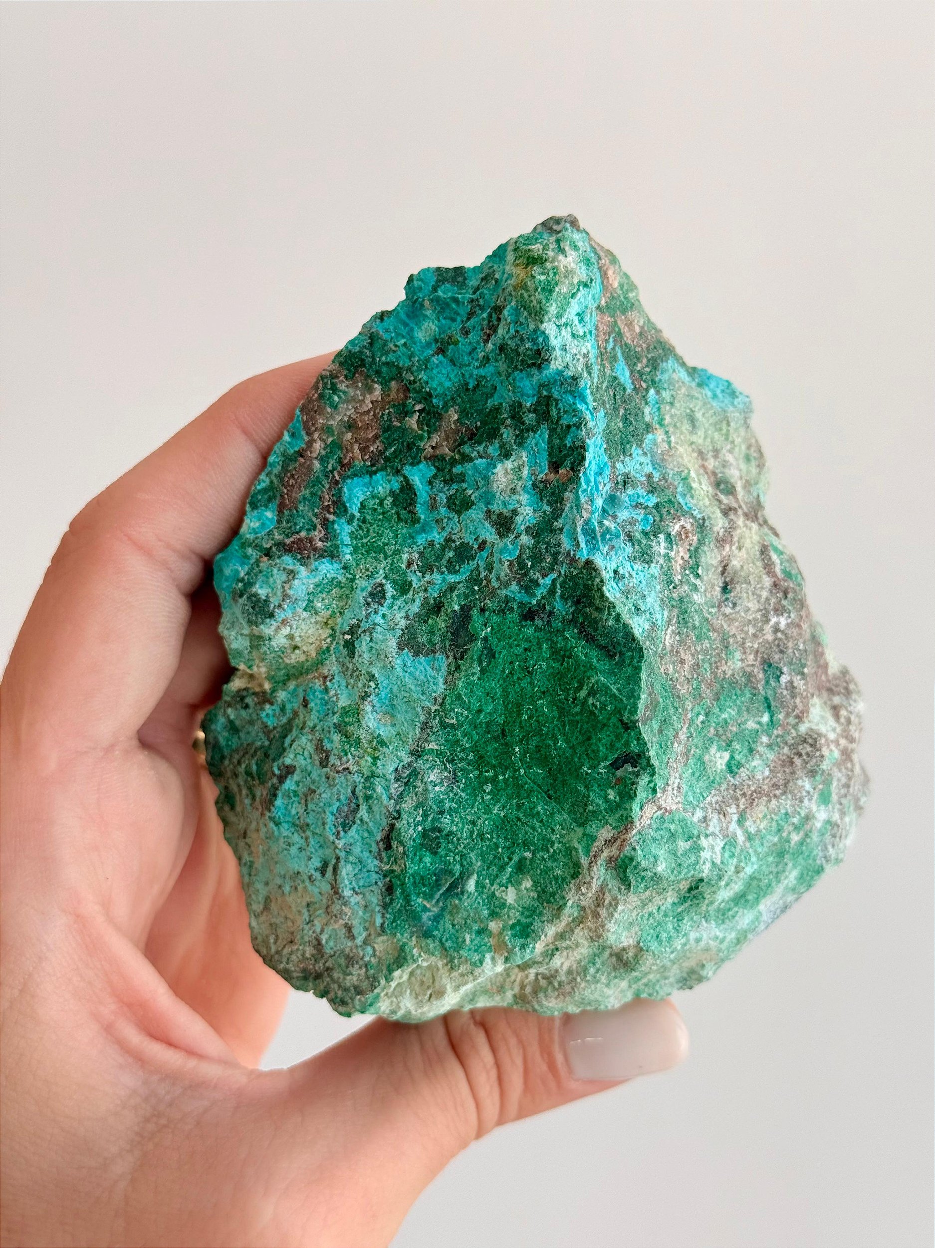 ⭐ Descrição Física: Apresenta uma combinação natural de tons azulados e verde intenso, formando padrões únicos devido à presença de Crisocola e Malaquita. Possui aspecto opaco, com superfície irregular característica da forma bruta e aparência marcante. Cada peça é única, podendo variar em tonalidade, brilho, formato e tamanho. Podem ocorrer veios, áreas mais opacas ou irregulares, características naturais da formação da pedra.