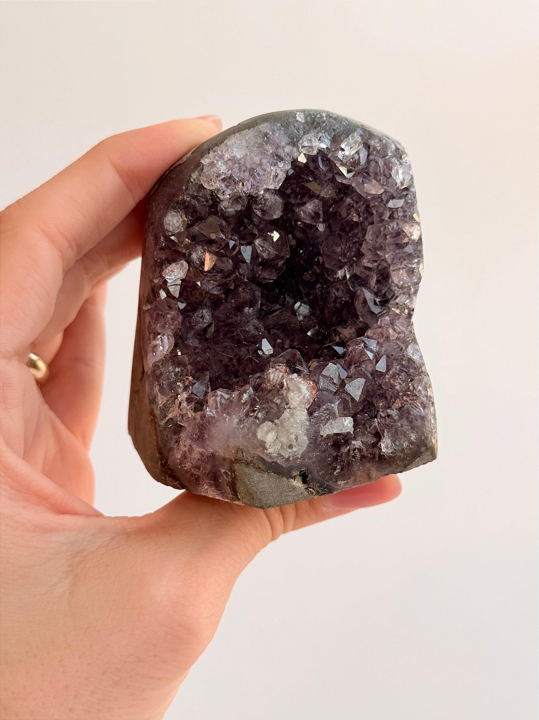 Quando estão nesse formado de "caverninha" são chamadas de Encantadas, com abertura frontal e cristais voltados para dentro, ela lembra visualmente um portal, um templo ou um espaço guardado, algo que “acolhe” e “protege” a energia. Seu visual desperta mistério, magia e encanto.