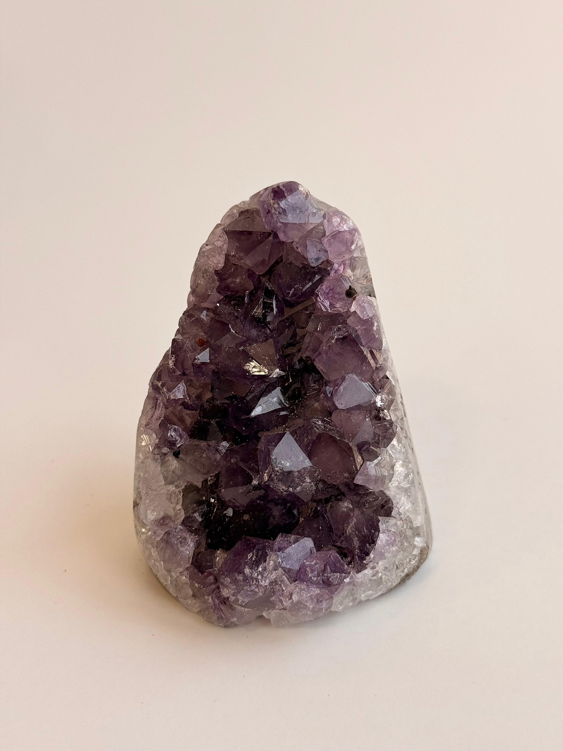 A Ametista é a pedra da espiritualidade e da intuição. É o cristal de maior eficácia na meditação, facilitando a conexão com seu Eu Superior. Transmite paz, espiritualidade, elimina o estresse e inspira a cura e intuição. Transmutação de pensamentos e energia, melhora padrão vibracional e desenvolvimento das habilidades intuitivas. Acalma o sistema nervoso, ameniza o estresse e a tensão interior. Elimina a raiva, medo, ansiedade. Auxilia no tratamento de enxaquecas e vícios. É o cristal que não pode faltar na sua vida.