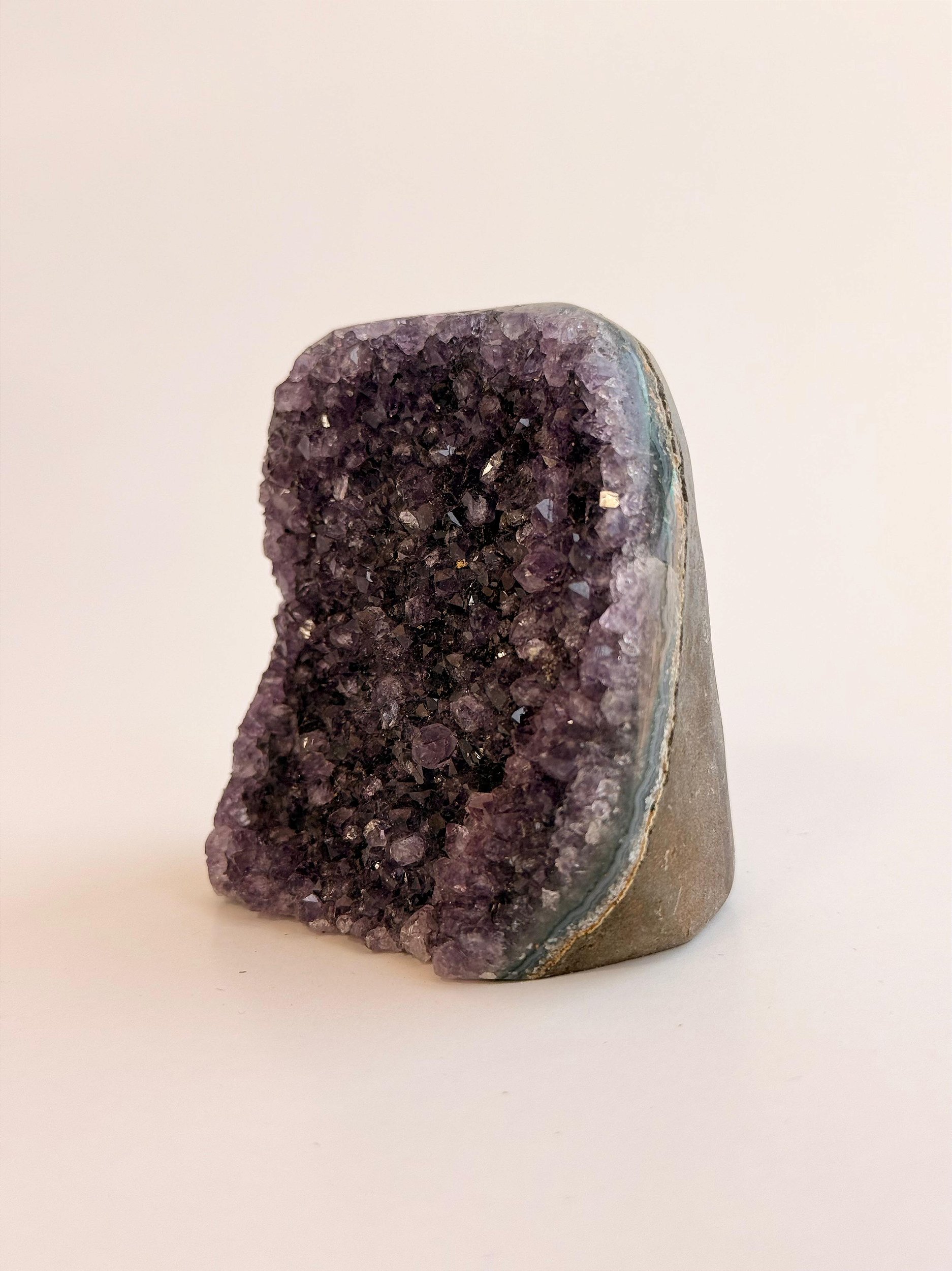 A Ametista é a pedra da espiritualidade e da intuição. É o cristal de maior eficácia na meditação, facilitando a conexão com seu Eu Superior. Transmite paz, espiritualidade, elimina o estresse e inspira a cura e intuição. Transmutação de pensamentos e energia, melhora padrão vibracional e desenvolvimento das habilidades intuitivas. Acalma o sistema nervoso, ameniza o estresse e a tensão interior. Elimina a raiva, medo, ansiedade. Auxilia no tratamento de enxaquecas e vícios. É o cristal que não pode faltar na sua vida.