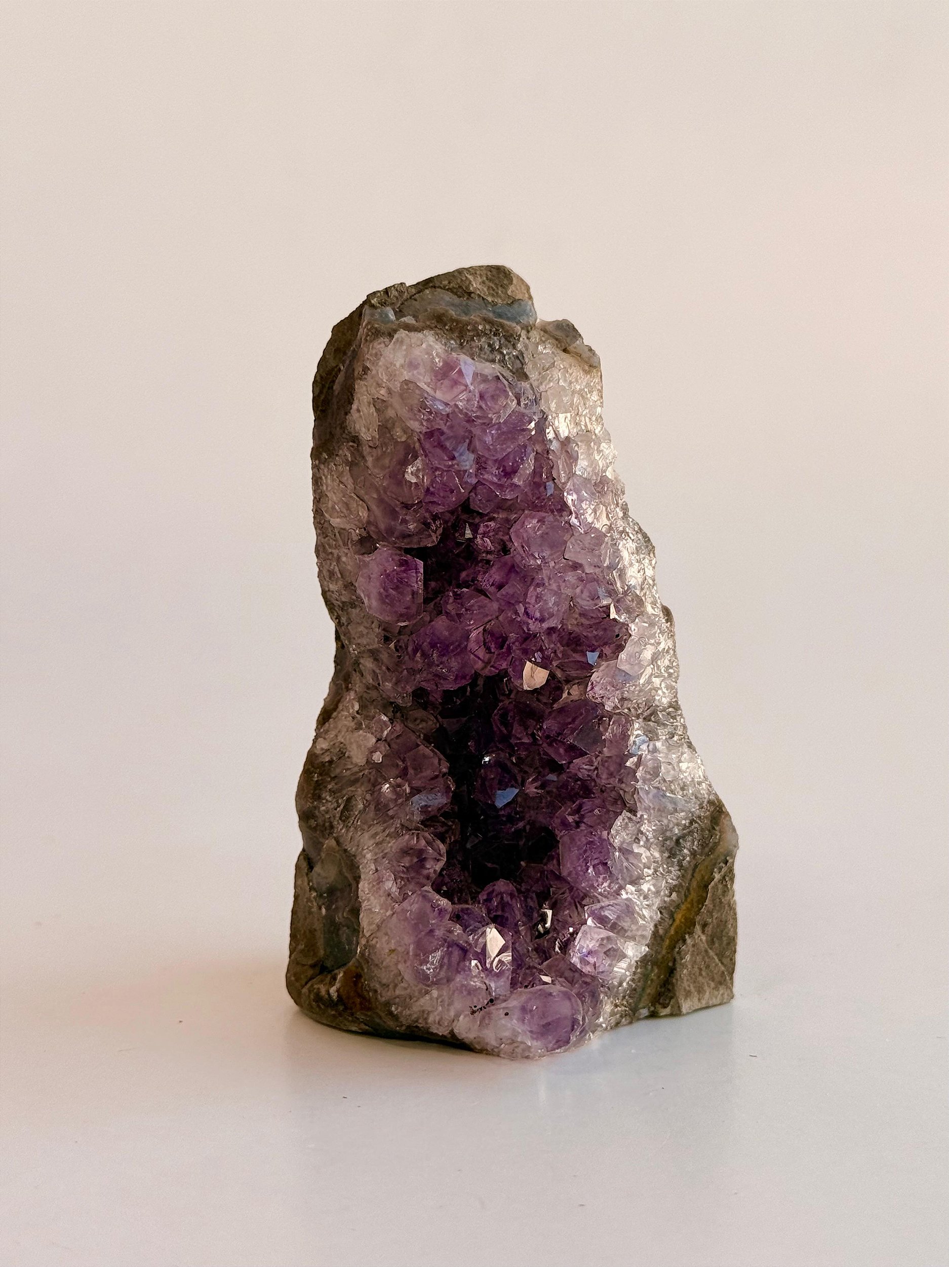A Ametista é a pedra da espiritualidade e da intuição. É o cristal de maior eficácia na meditação, facilitando a conexão com seu Eu Superior. Transmite paz, espiritualidade, elimina o estresse e inspira a cura e intuição. Transmutação de pensamentos e energia, melhora padrão vibracional e desenvolvimento das habilidades intuitivas. Acalma o sistema nervoso, ameniza o estresse e a tensão interior. Elimina a raiva, medo, ansiedade. Auxilia no tratamento de enxaquecas e vícios. É o cristal que não pode faltar na sua vida.