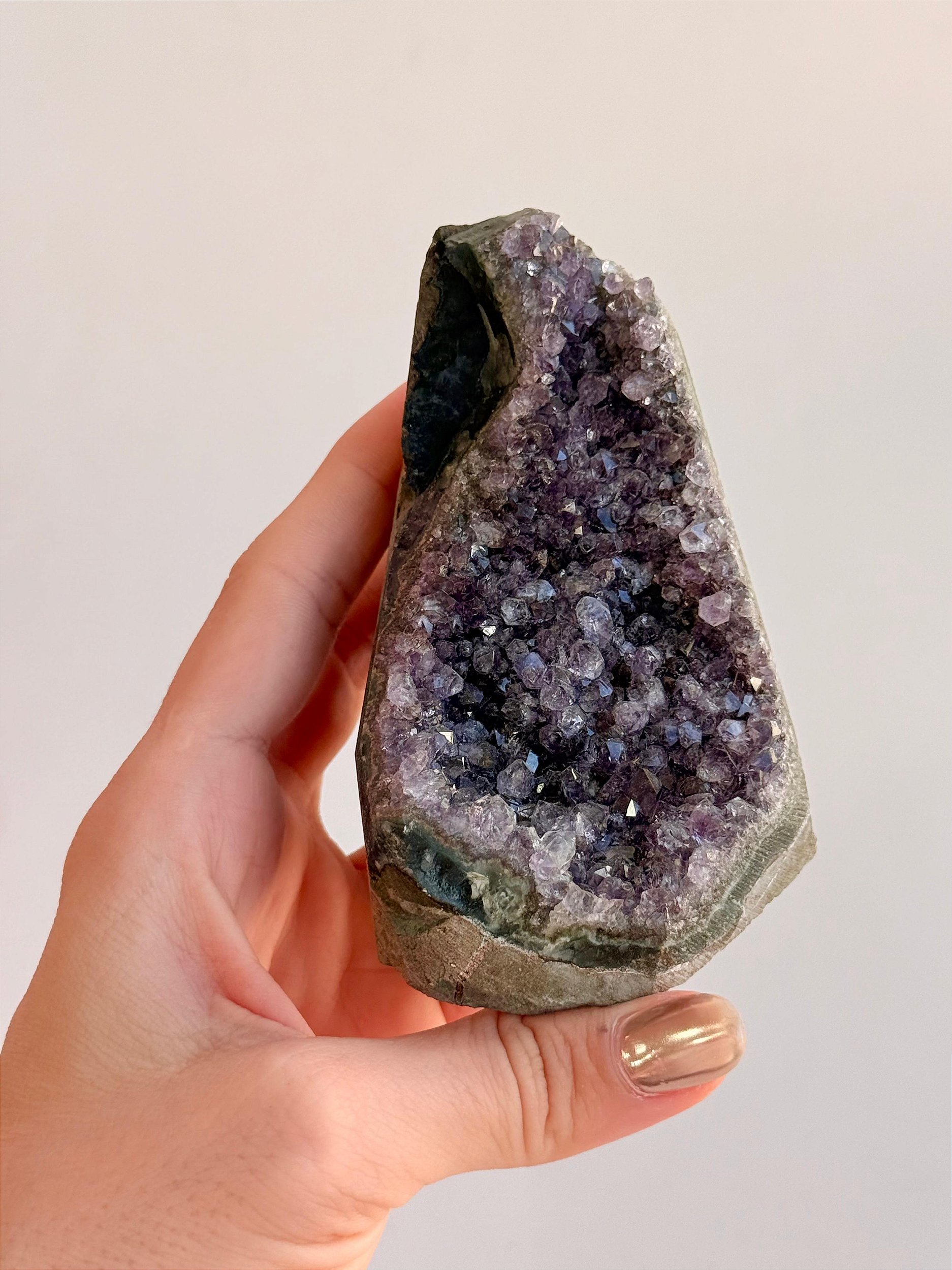 A Ametista é a pedra da espiritualidade e da intuição. É o cristal de maior eficácia na meditação, facilitando a conexão com seu Eu Superior. Transmite paz, espiritualidade, elimina o estresse e inspira a cura e intuição. Transmutação de pensamentos e energia, melhora padrão vibracional e desenvolvimento das habilidades intuitivas. Acalma o sistema nervoso, ameniza o estresse e a tensão interior. Elimina a raiva, medo, ansiedade. Auxilia no tratamento de enxaquecas e vícios. É o cristal que não pode faltar na sua vida.
