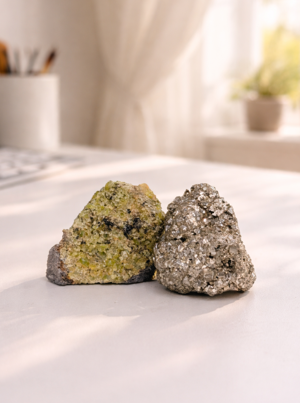 Esses cristais trazem a união de duas forças: A transformação do Peridoto com a capacidade de materialização financeira da Pirita.