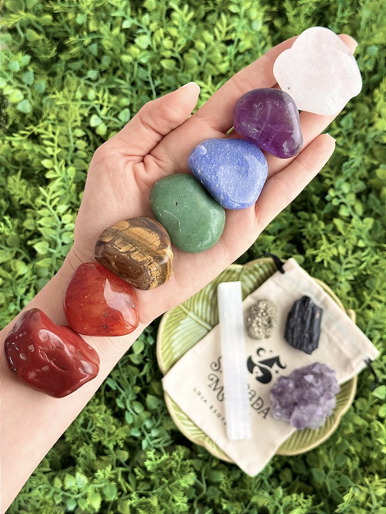 O kit essencial é perfeito para quem está iniciando no mundo dos cristais. Nele estão as principais pedras que não podem faltar no seu dia a dia! Proteção, limpeza energética, purificação, alinhamento dos chakras, energias de vitalidade, disposição, calma, paz, amor, prosperidade, equilíbrio físico e emocional e muito mais!