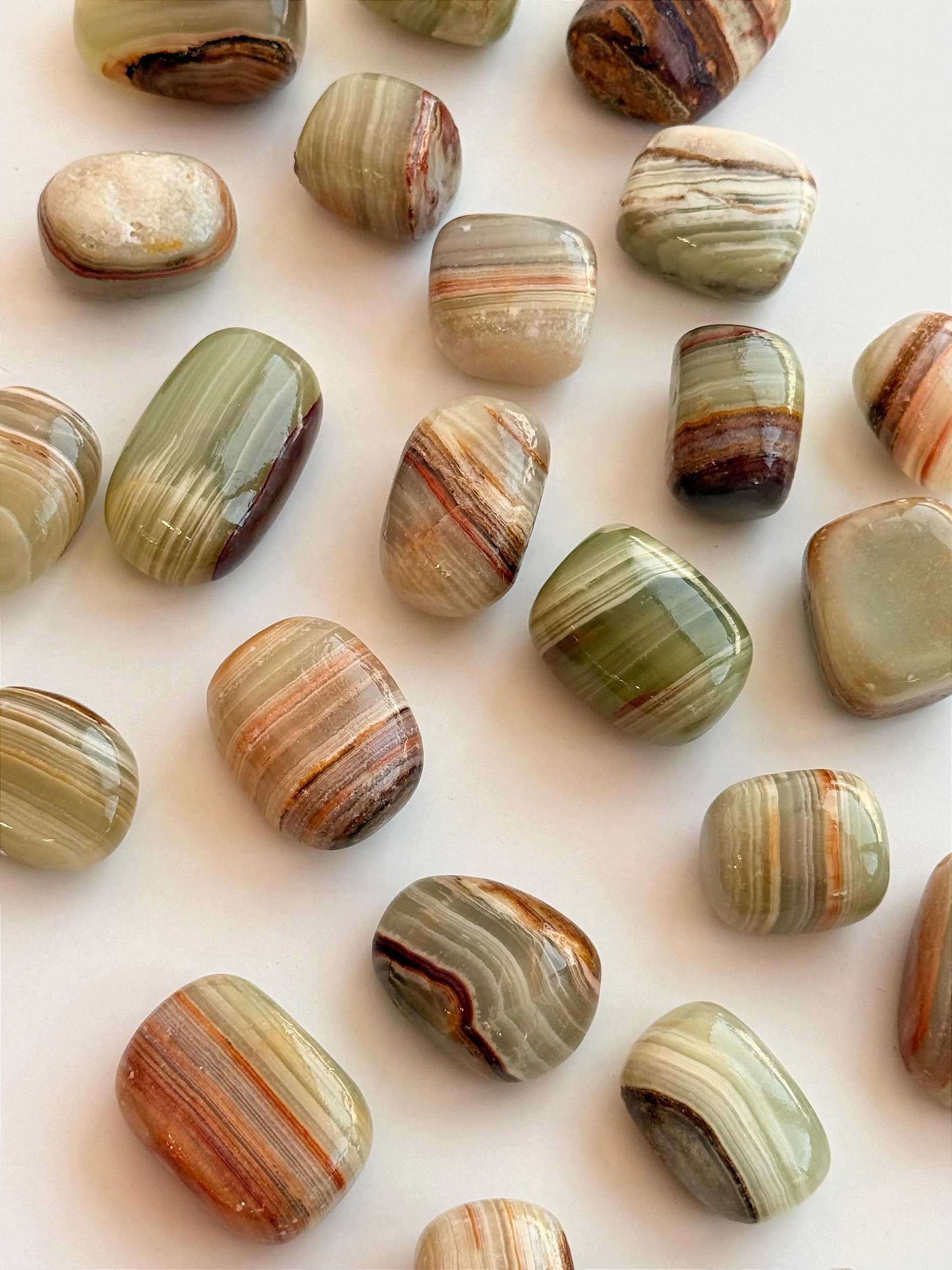 ⭐ Descrição Física: Apresenta coloração em tons de verde, bege e marrom, com faixas e listras naturais bem marcadas que formam padrões únicos. Possui brilho polido e aspecto levemente translúcido em algumas áreas, com aparência lisa e toque suave. Cada peça é única, podendo variar em tonalidade, brilho, formato e tamanho. Podem ocorrer veios, áreas mais opacas ou irregulares, características naturais da formação da pedra.