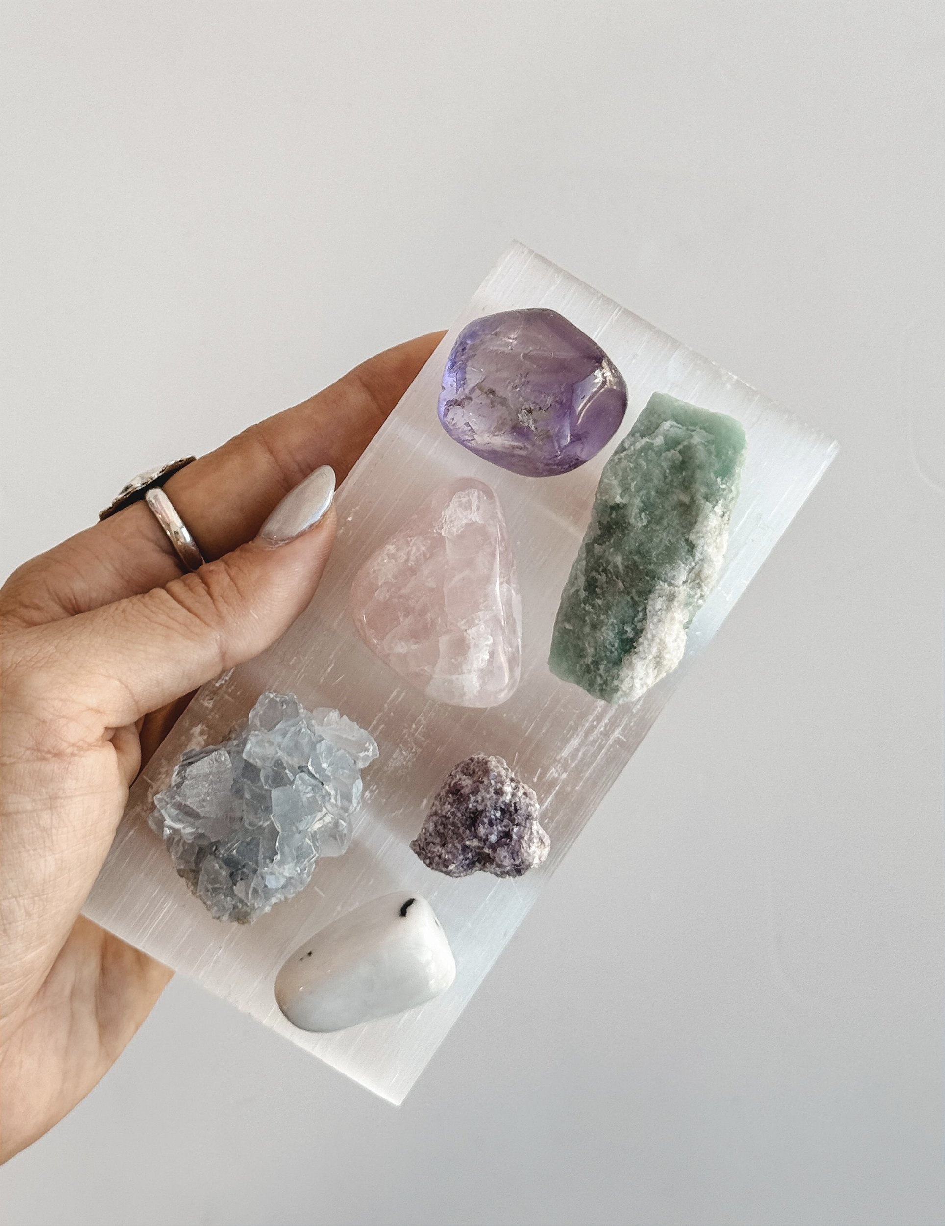 Coloque seus cristais sobre a placa de Selenita por algumas horas ou durante a noite para restaurar sua energia.