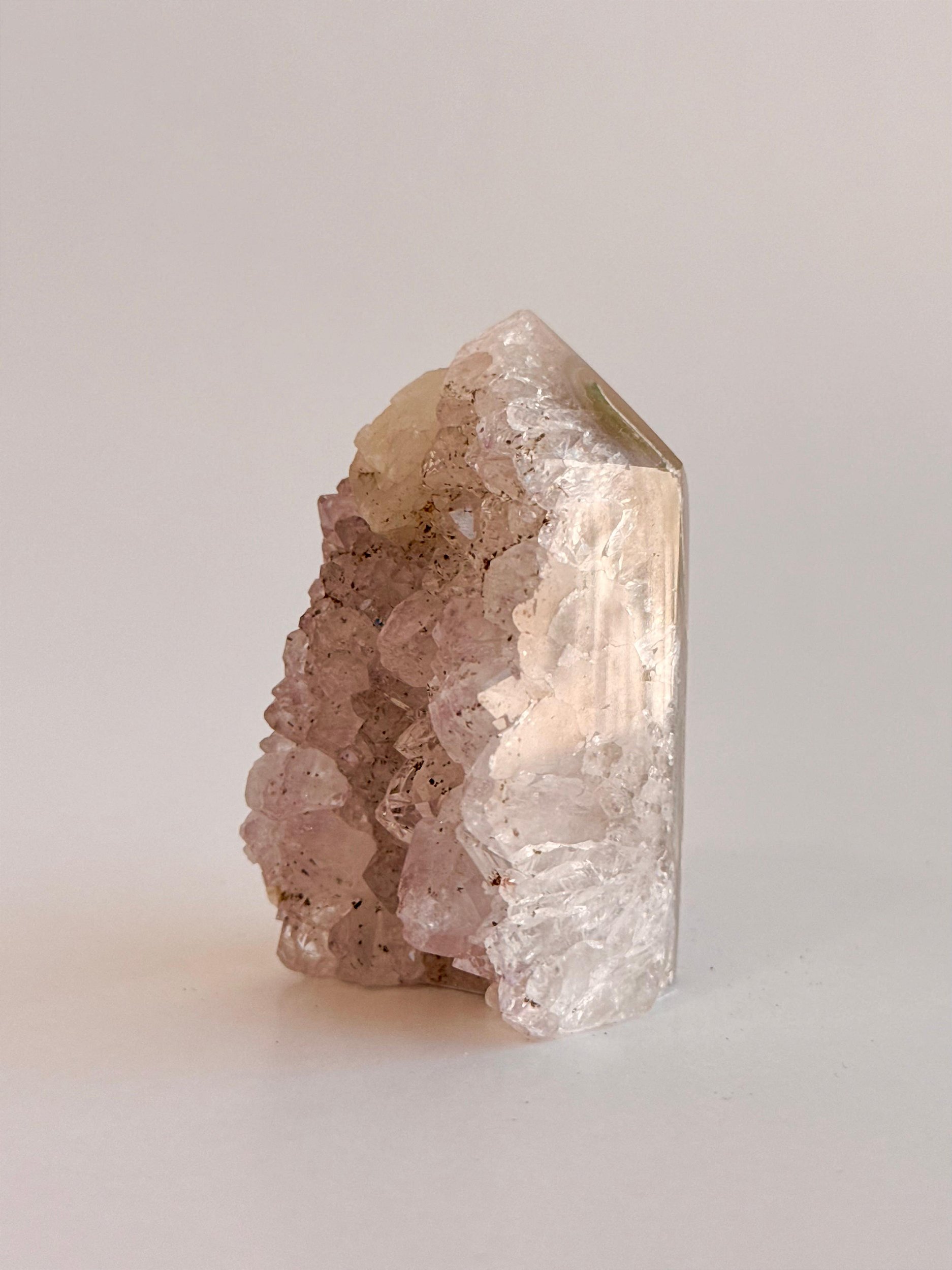 ⭐ Descrição Física: Apresenta um formato de ponta, com estrutura bem definida. Sua frente, disposta na vertical, revela uma bela drusa composta por múltiplos cristais, com brilho vítreo e superfície rica em textura. Nas laterais e parte posterior, observa-se a aparência de geodo com acabamento polido, trazendo um visual mais suave e refinado, que contrasta delicadamente com a parte frontal cristalina. Cada peça é única, podendo variar em tonalidade, brilho, formato e tamanho. Podem ocorrer veios, áreas mais opacas ou irregulares, características naturais da formação da pedra.