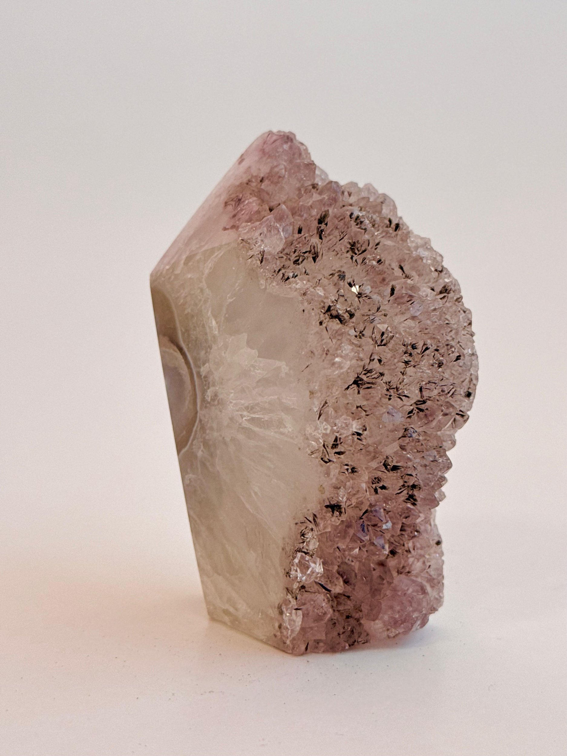 ⭐ Descrição Física: Apresenta um formato de ponta, com estrutura bem definida. Sua frente, disposta na vertical, revela uma bela drusa composta por múltiplos cristais, com brilho vítreo e superfície rica em textura. Nas laterais e parte posterior, observa-se a aparência de geodo com acabamento polido, trazendo um visual mais suave e refinado, que contrasta delicadamente com a parte frontal cristalina. Cada peça é única, podendo variar em tonalidade, brilho, formato e tamanho. Podem ocorrer veios, áreas mais opacas ou irregulares, características naturais da formação da pedra.