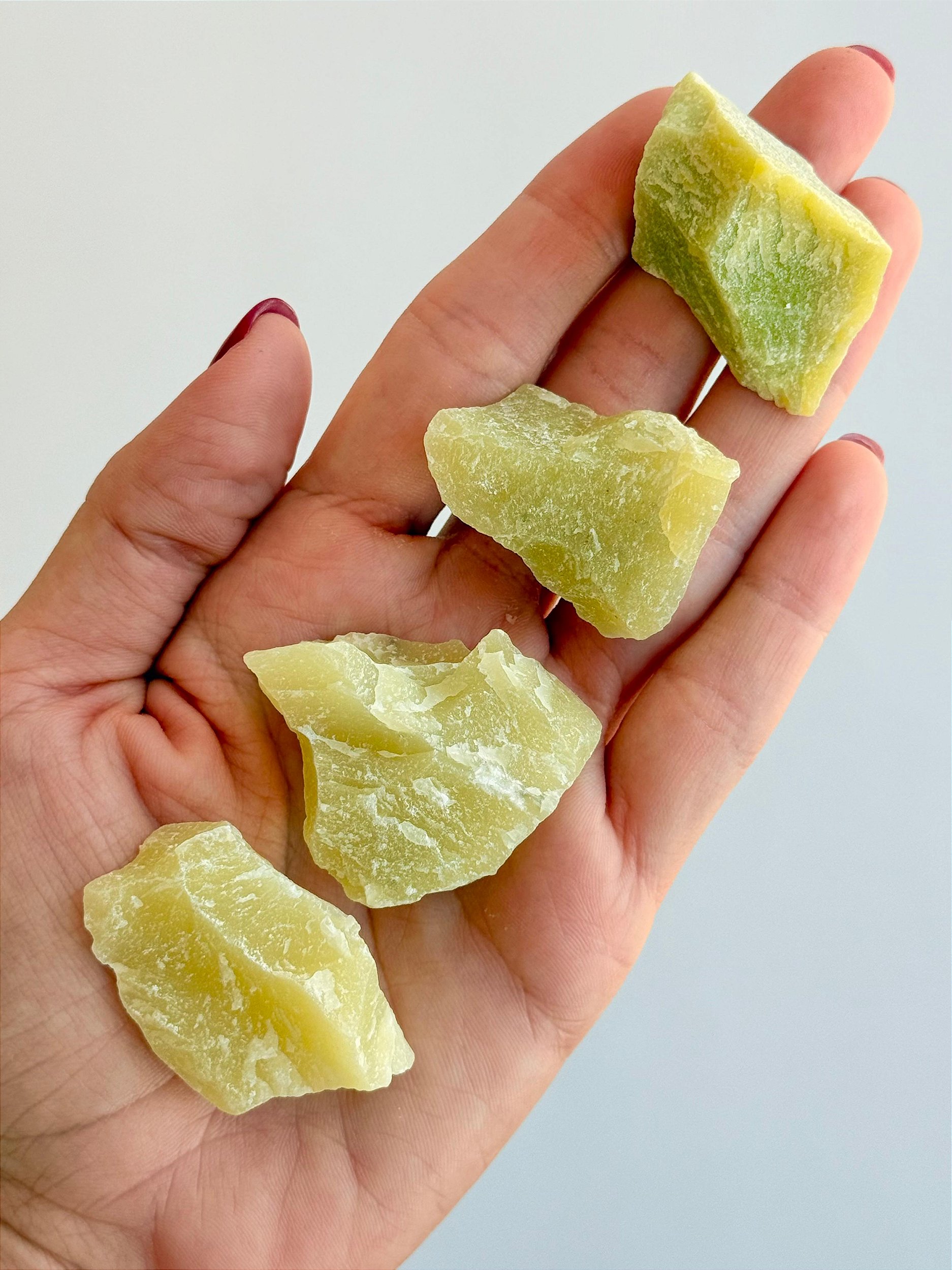 ⭐ Descrição Física: Apresenta coloração amarelo-esverdeada, semelhante ao tom do limão, com brilho vítreo suave e aspecto luminoso. Possui transparência translúcida a transparente, refletindo a luz de forma delicada. Cada peça é única, podendo variar em tonalidade, brilho, formato e tamanho. Podem ocorrer veios, áreas mais opacas ou irregulares, características naturais da formação da pedra.