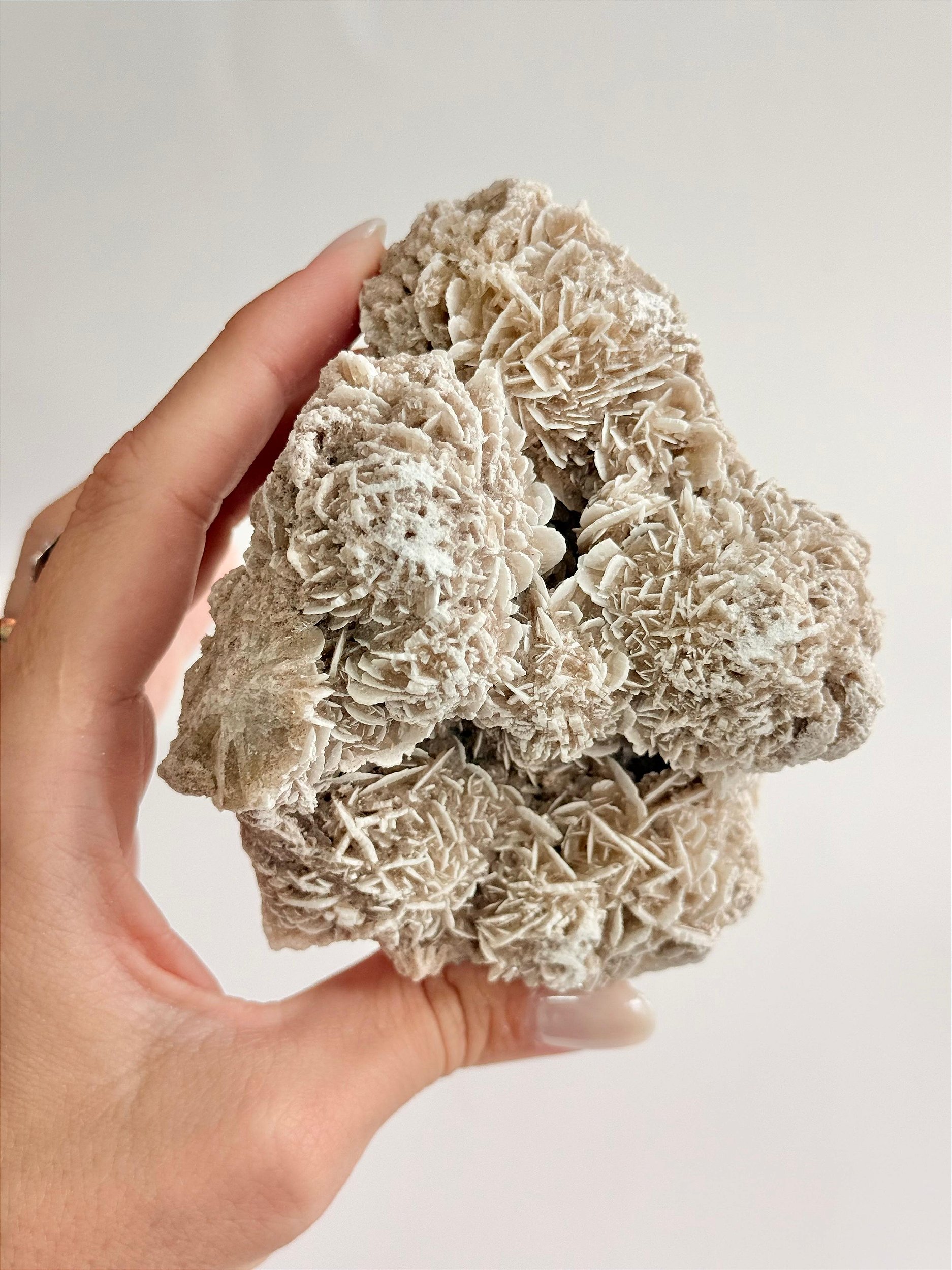 Sua textura é seca e levemente porosa, com um aspecto fosco e terroso, transmitindo uma sensação de rusticidade e força natural. Cada peça é completamente diferente da outra: algumas são mais abertas, outras mais compactas, com pétalas largas ou mais fechadas, o que reforça seu caráter bruto e autêntico. É uma pedra que chama atenção pela forma incomum e simbólica, evocando estabilidade, resistência e beleza natural esculpida pelo deserto.