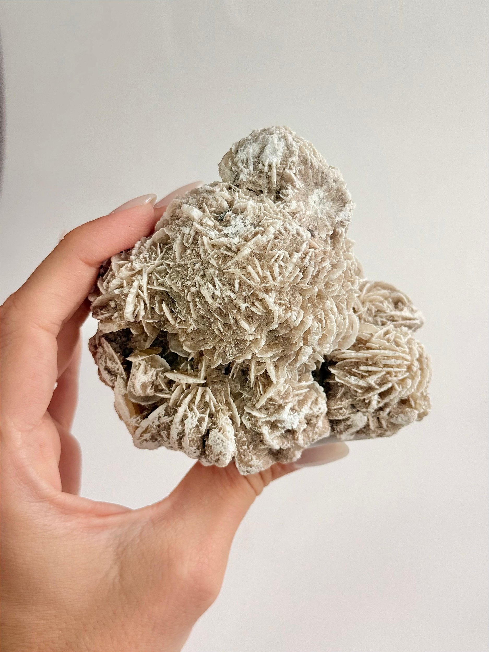 Sua textura é seca e levemente porosa, com um aspecto fosco e terroso, transmitindo uma sensação de rusticidade e força natural. Cada peça é completamente diferente da outra: algumas são mais abertas, outras mais compactas, com pétalas largas ou mais fechadas, o que reforça seu caráter bruto e autêntico. É uma pedra que chama atenção pela forma incomum e simbólica, evocando estabilidade, resistência e beleza natural esculpida pelo deserto.