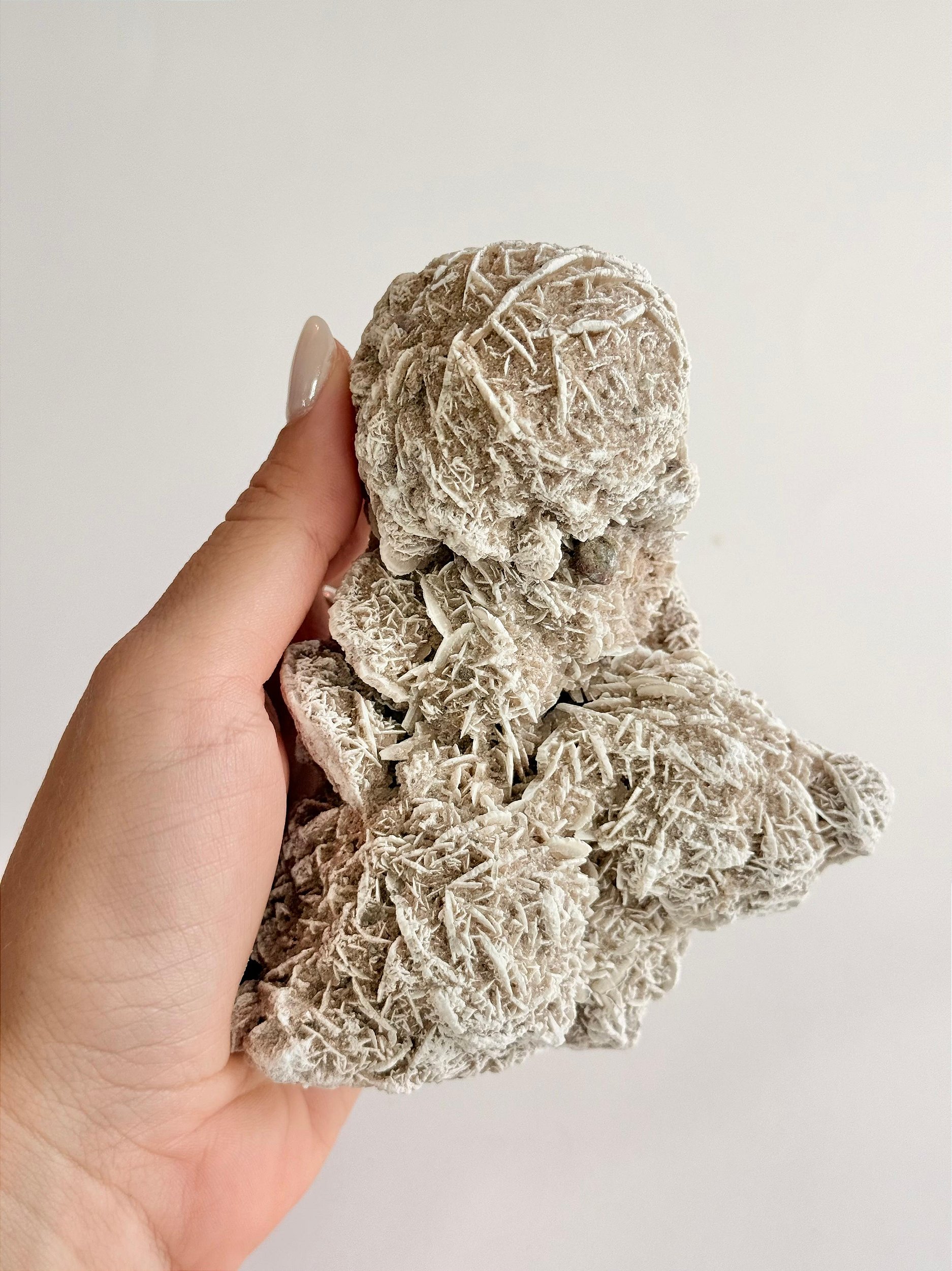 Sua textura é seca e levemente porosa, com um aspecto fosco e terroso, transmitindo uma sensação de rusticidade e força natural. Cada peça é completamente diferente da outra: algumas são mais abertas, outras mais compactas, com pétalas largas ou mais fechadas, o que reforça seu caráter bruto e autêntico. É uma pedra que chama atenção pela forma incomum e simbólica, evocando estabilidade, resistência e beleza natural esculpida pelo deserto.