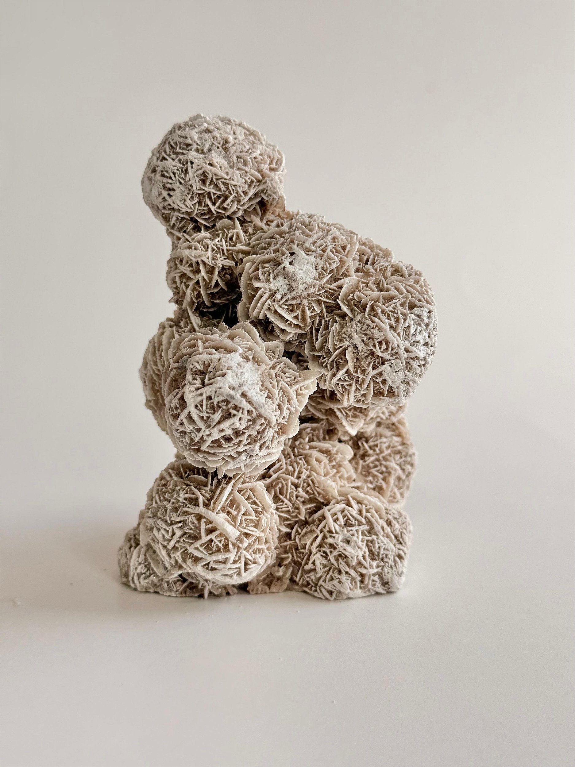 Sua textura é seca e levemente porosa, com um aspecto fosco e terroso, transmitindo uma sensação de rusticidade e força natural. Cada peça é completamente diferente da outra: algumas são mais abertas, outras mais compactas, com pétalas largas ou mais fechadas, o que reforça seu caráter bruto e autêntico. É uma pedra que chama atenção pela forma incomum e simbólica, evocando estabilidade, resistência e beleza natural esculpida pelo deserto.