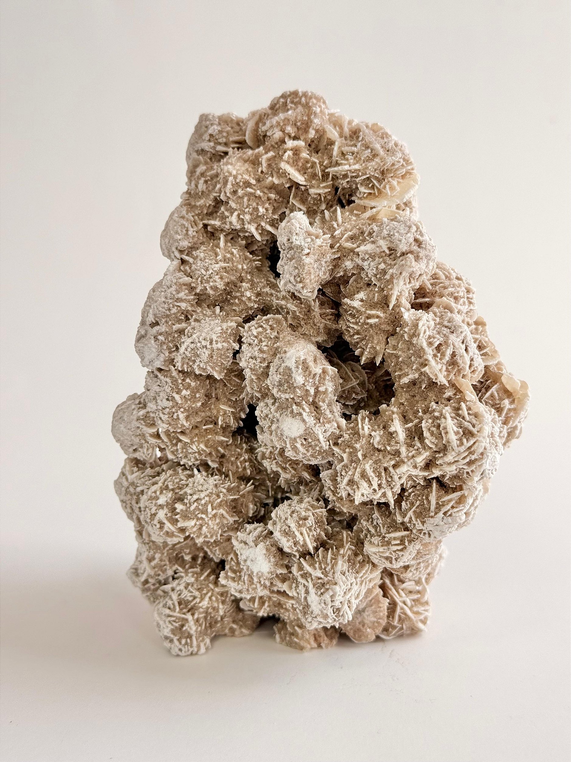 Sua textura é seca e levemente porosa, com um aspecto fosco e terroso, transmitindo uma sensação de rusticidade e força natural. Cada peça é completamente diferente da outra: algumas são mais abertas, outras mais compactas, com pétalas largas ou mais fechadas, o que reforça seu caráter bruto e autêntico. É uma pedra que chama atenção pela forma incomum e simbólica, evocando estabilidade, resistência e beleza natural esculpida pelo deserto.