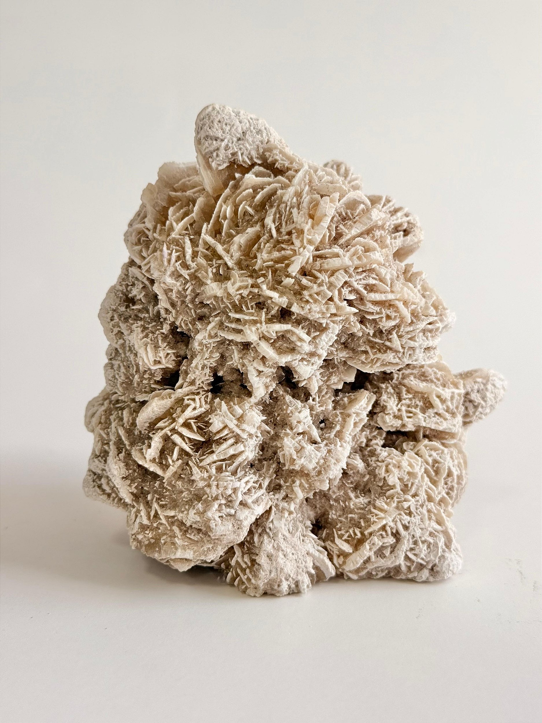 Sua textura é seca e levemente porosa, com um aspecto fosco e terroso, transmitindo uma sensação de rusticidade e força natural. Cada peça é completamente diferente da outra: algumas são mais abertas, outras mais compactas, com pétalas largas ou mais fechadas, o que reforça seu caráter bruto e autêntico. É uma pedra que chama atenção pela forma incomum e simbólica, evocando estabilidade, resistência e beleza natural esculpida pelo deserto.