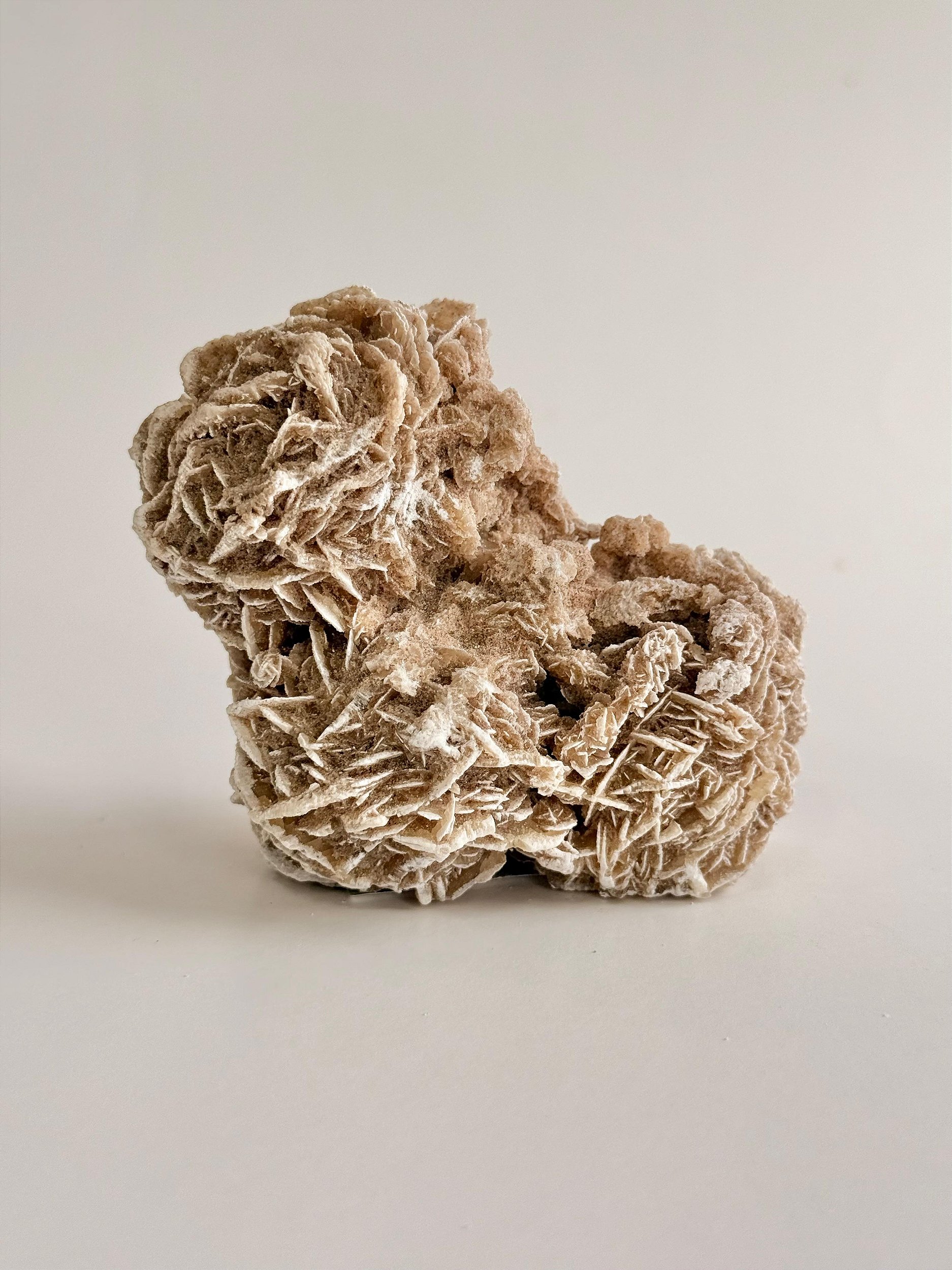 Sua textura é seca e levemente porosa, com um aspecto fosco e terroso, transmitindo uma sensação de rusticidade e força natural. Cada peça é completamente diferente da outra: algumas são mais abertas, outras mais compactas, com pétalas largas ou mais fechadas, o que reforça seu caráter bruto e autêntico. É uma pedra que chama atenção pela forma incomum e simbólica, evocando estabilidade, resistência e beleza natural esculpida pelo deserto.