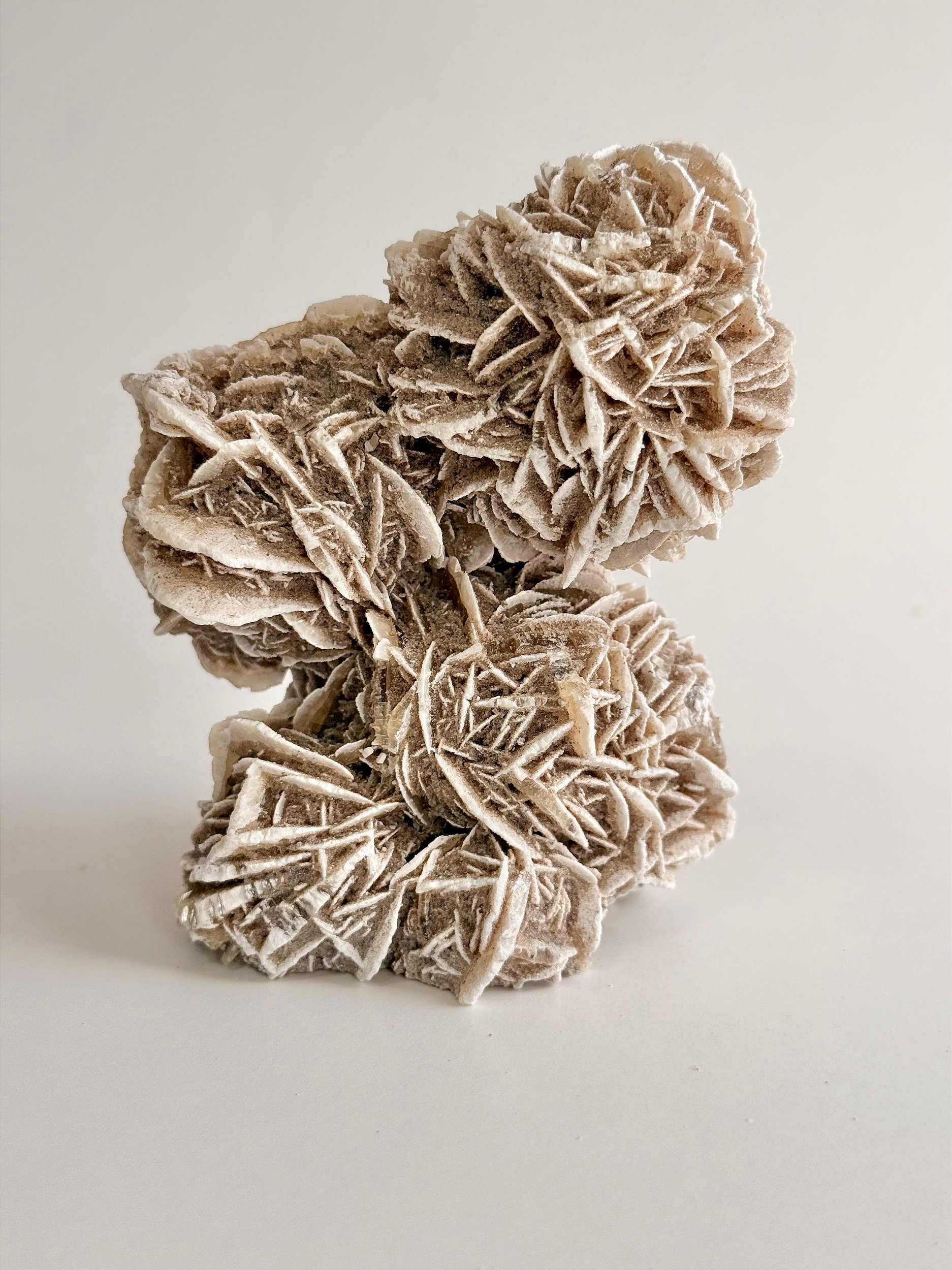 Sua textura é seca e levemente porosa, com um aspecto fosco e terroso, transmitindo uma sensação de rusticidade e força natural. Cada peça é completamente diferente da outra: algumas são mais abertas, outras mais compactas, com pétalas largas ou mais fechadas, o que reforça seu caráter bruto e autêntico. É uma pedra que chama atenção pela forma incomum e simbólica, evocando estabilidade, resistência e beleza natural esculpida pelo deserto.