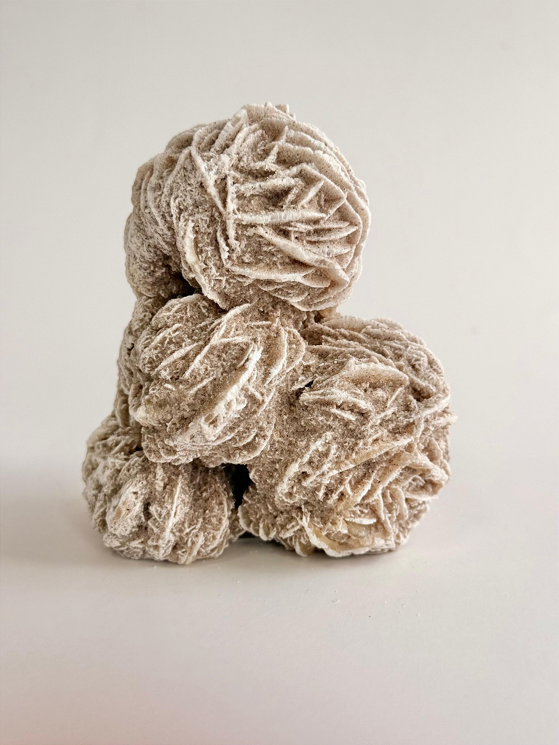 Sua textura é seca e levemente porosa, com um aspecto fosco e terroso, transmitindo uma sensação de rusticidade e força natural. Cada peça é completamente diferente da outra: algumas são mais abertas, outras mais compactas, com pétalas largas ou mais fechadas, o que reforça seu caráter bruto e autêntico. É uma pedra que chama atenção pela forma incomum e simbólica, evocando estabilidade, resistência e beleza natural esculpida pelo deserto.