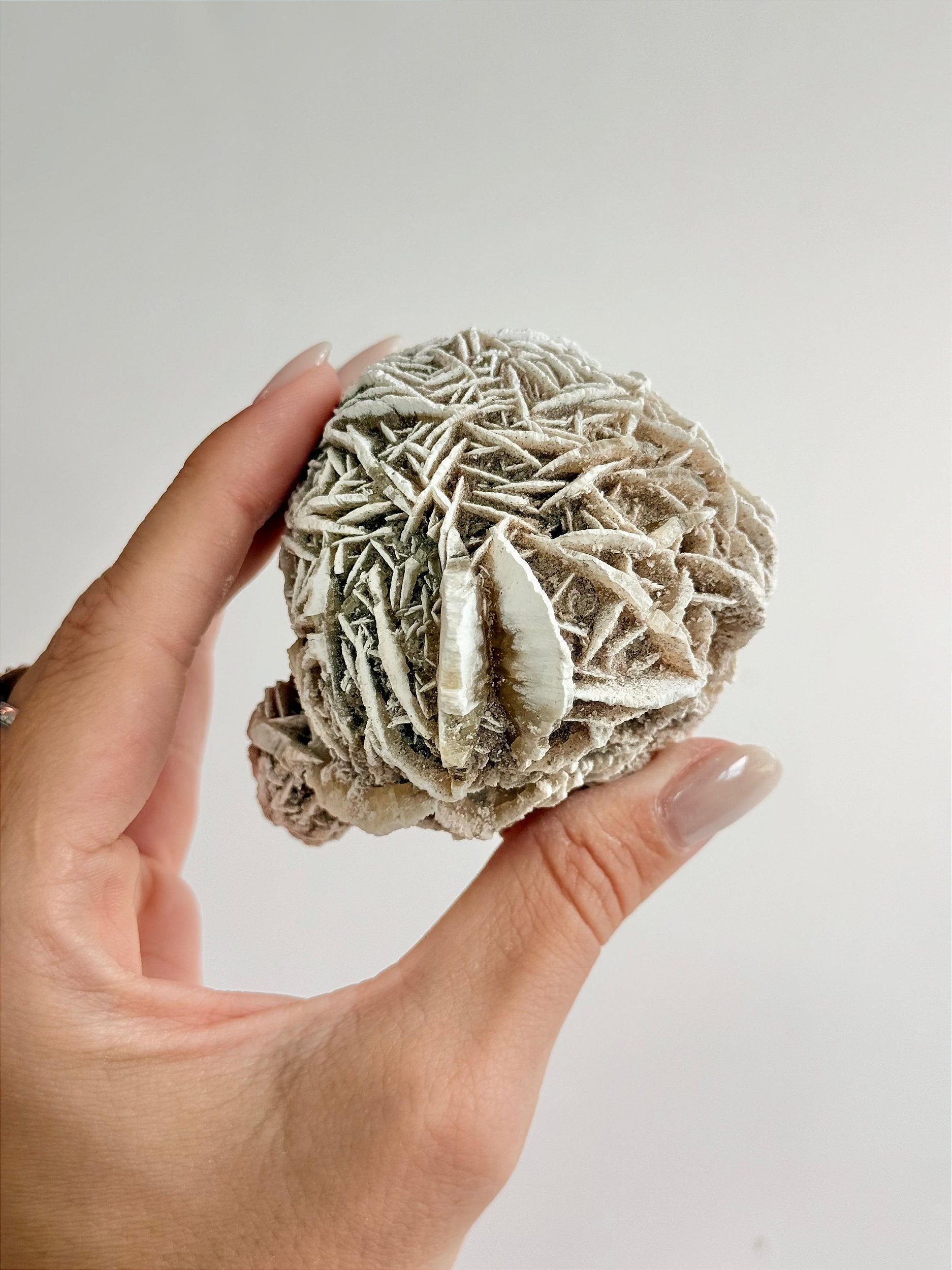 Sua textura é seca e levemente porosa, com um aspecto fosco e terroso, transmitindo uma sensação de rusticidade e força natural. Cada peça é completamente diferente da outra: algumas são mais abertas, outras mais compactas, com pétalas largas ou mais fechadas, o que reforça seu caráter bruto e autêntico. É uma pedra que chama atenção pela forma incomum e simbólica, evocando estabilidade, resistência e beleza natural esculpida pelo deserto.