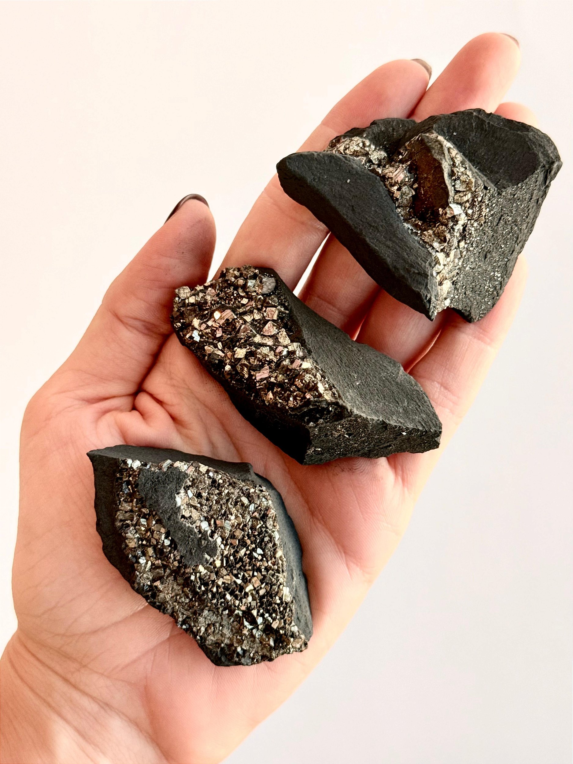 A Shungita com inclusões de Pirita forma uma combinação rara e poderosa, unindo as propriedades protetoras e purificadoras da Shungita com as energias revitalizantes e prósperas da Pirita, criando uma pedra ideal para quem busca proteção, equilíbrio e caminhos abertos no plano físico e espiritual.
