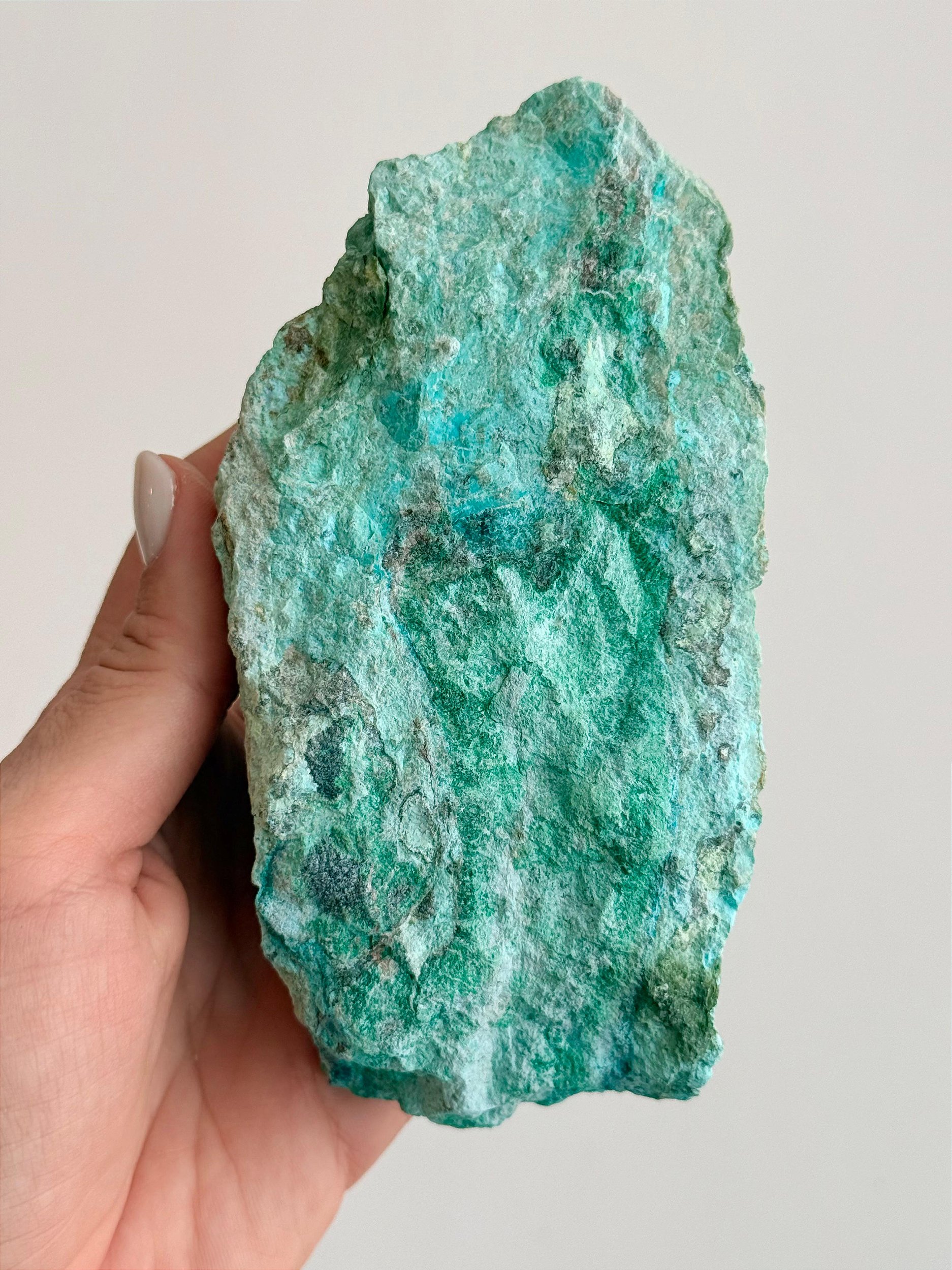 ⭐ Descrição Física: Apresenta uma combinação natural de cores entre azul, azul-esverdeado e verde intenso, com padrões únicos formados pela presença de Turquesa, Crisocola e Malaquita. Possui aspecto opaco, com superfície irregular característica da forma bruta e aparência marcante e exótica. Cada peça é única, podendo variar em tonalidade, brilho, formato e tamanho. Podem ocorrer veios, áreas mais opacas ou irregulares, características naturais da formação da pedra.