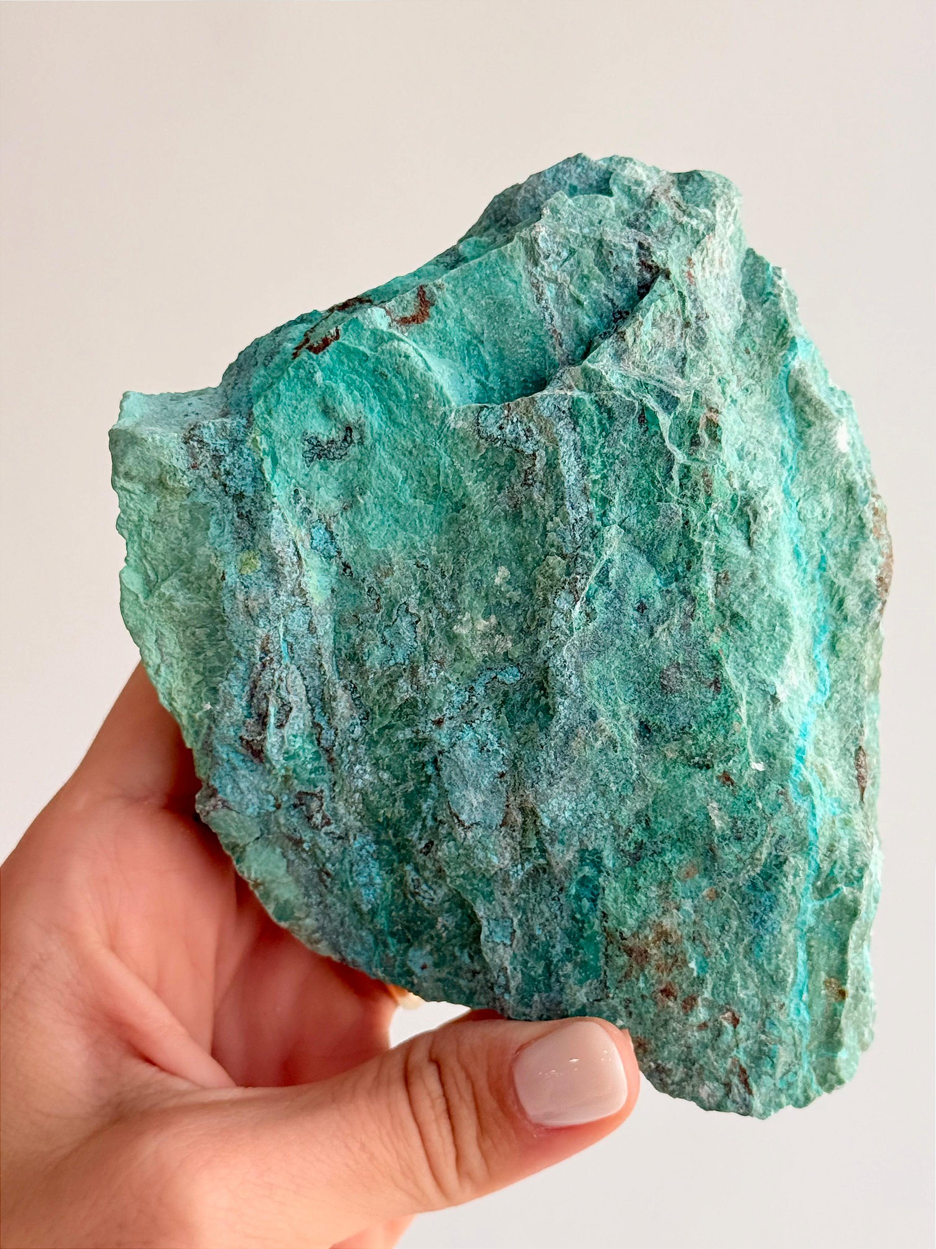 ⭐ Descrição Física: Apresenta coloração que varia entre azul, azul-esverdeado e tons mais intensos de verde, formando padrões naturais únicos devido à presença de Turquesa e Crisocola. Possui aspecto opaco, com superfície irregular característica da forma bruta e aparência marcante. Cada peça é única, podendo variar em tonalidade, brilho, formato e tamanho. Podem ocorrer veios, áreas mais opacas ou irregulares, características naturais da formação da pedra.