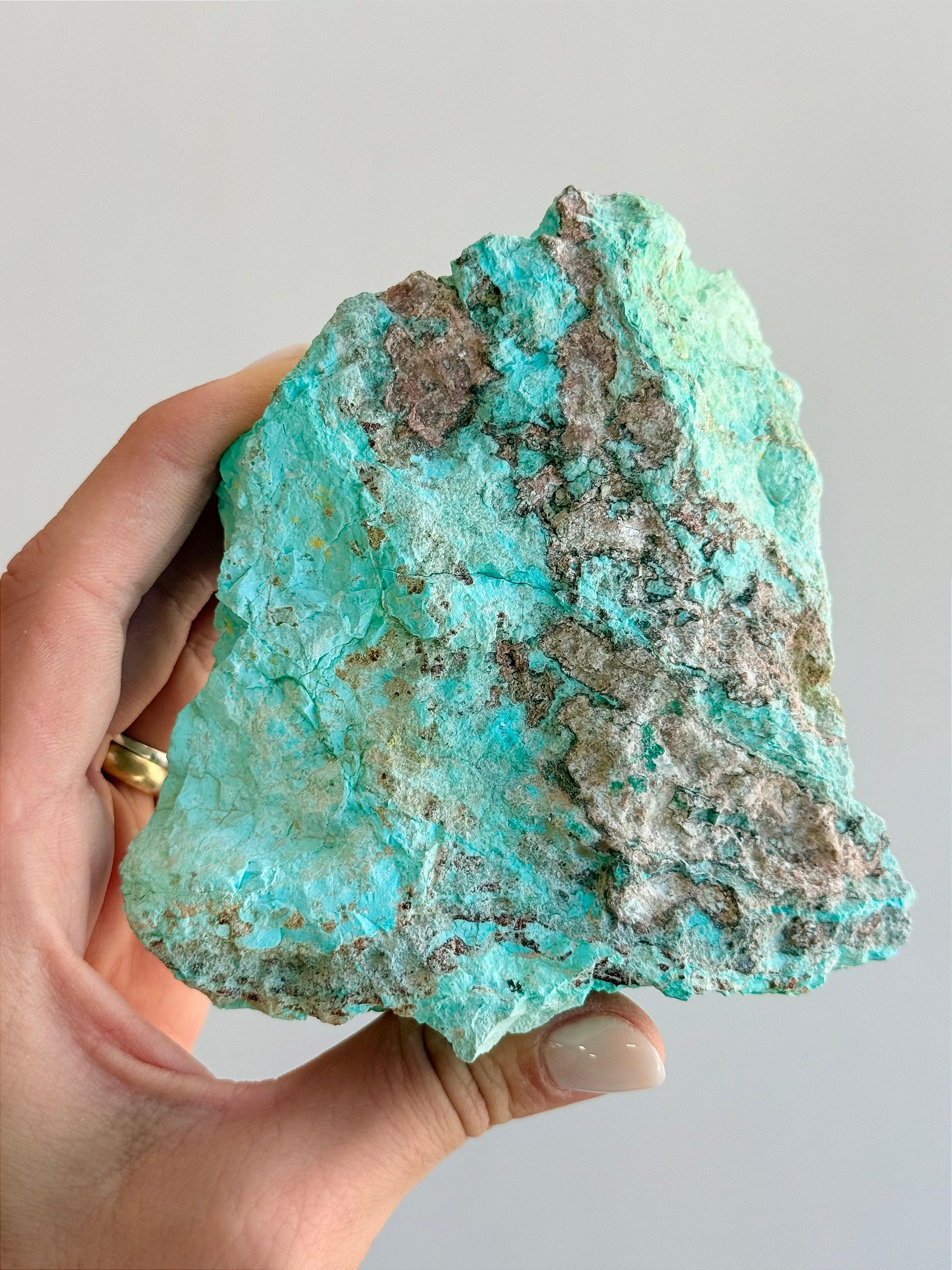 Formada naturalmente em regiões ricas em cobre, especialmente no Peru, a Turquesa Peruana surge ao longo de milhares de anos através da ação de minerais e água em rochas, resultando em suas cores únicas e padrões naturais marcantes.