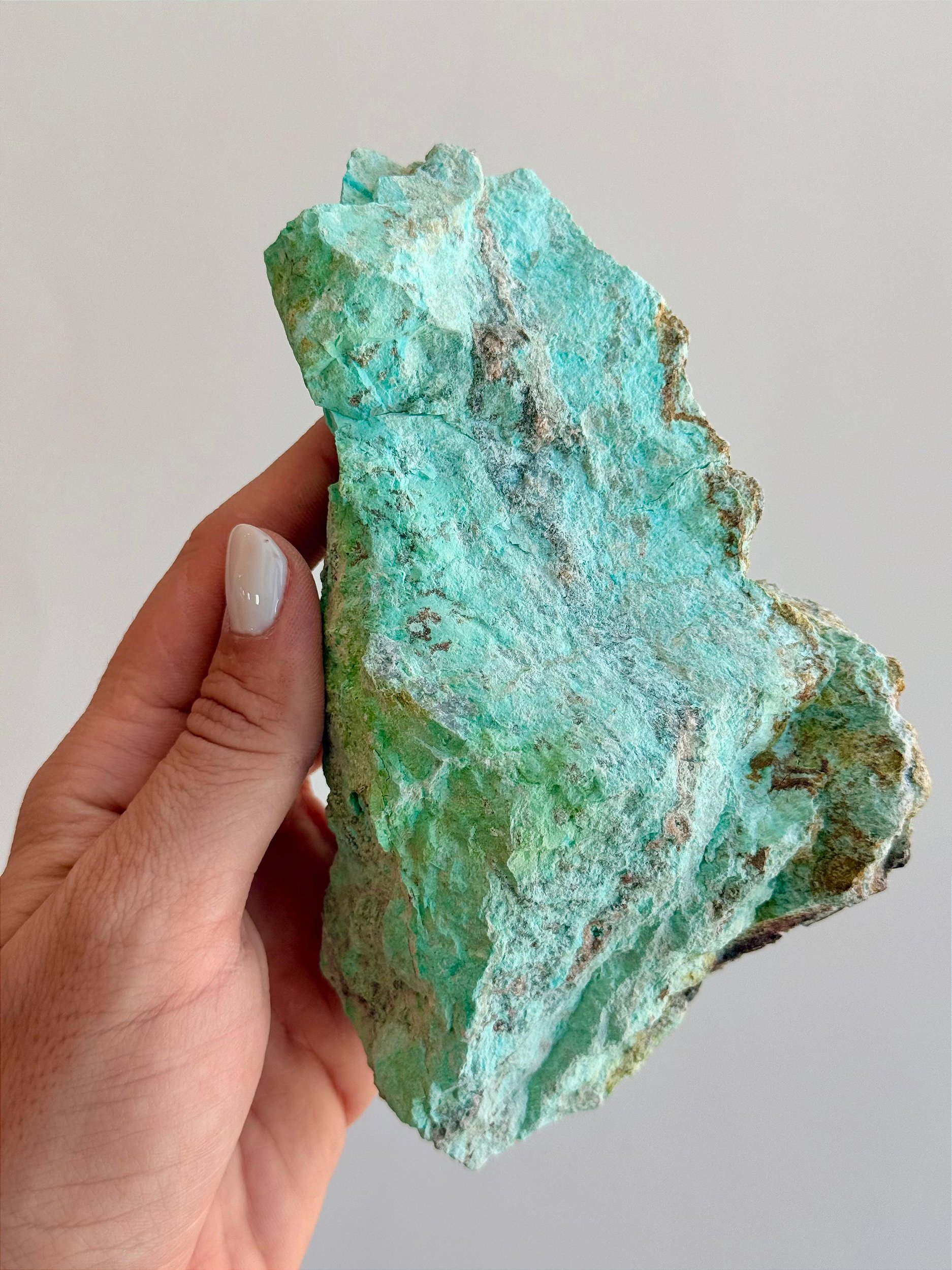 ⭐ Descrição Física: Apresenta coloração azul a azul-esverdeada, podendo variar em intensidade e conter veios naturais escuros, acinzentados ou amarronzados. Possui aspecto opaco, com superfície irregular característica da forma bruta e aparência marcante. Cada peça é única, podendo variar em tonalidade, brilho, formato e tamanho. Podem ocorrer veios, áreas mais opacas ou irregulares, características naturais da formação da pedra.