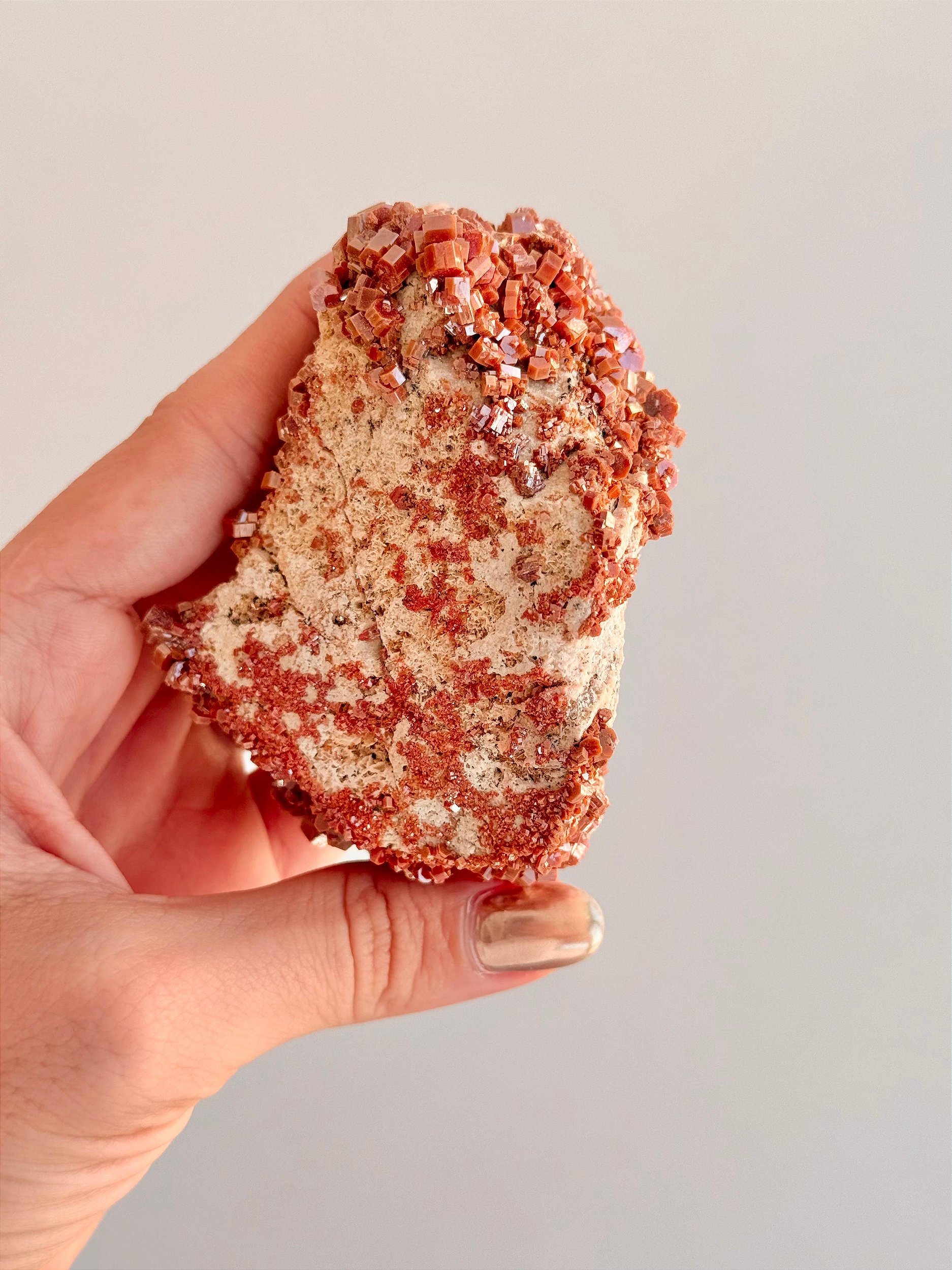 A Vanadinita é um cristal fascinante, conhecido por seus tons vibrantes de vermelho, laranja e marrom, que lembram pequenas chamas cristalizadas. Pertencente ao grupo dos minerais de vanadato de chumbo, ela é encontrada principalmente no Marrocos, México e EUA, e se destaca por sua aparência geométrica em cristais hexagonais bem definidos e altamente energéticos.