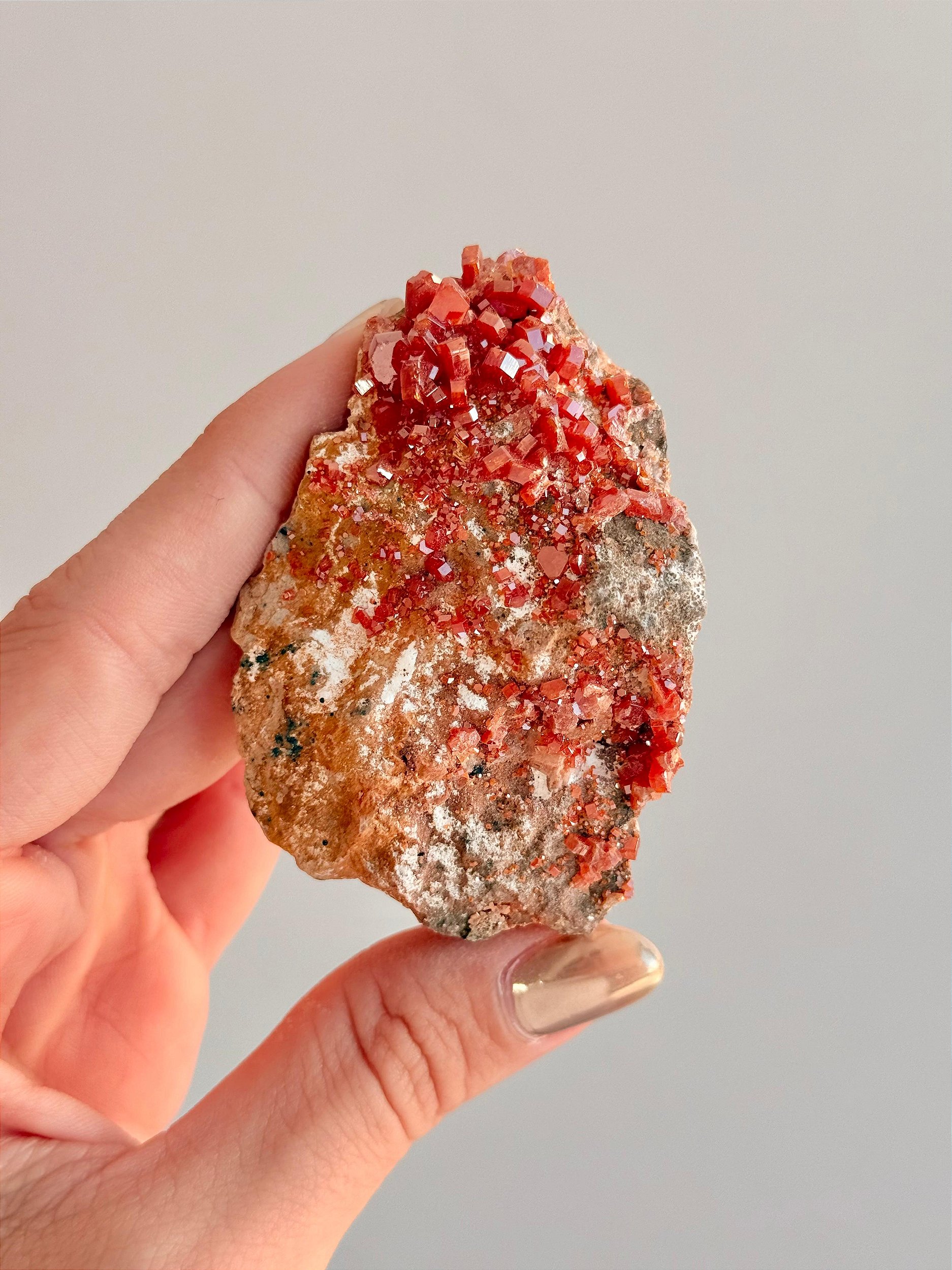 A Vanadinita é um cristal fascinante, conhecido por seus tons vibrantes de vermelho, laranja e marrom, que lembram pequenas chamas cristalizadas. Pertencente ao grupo dos minerais de vanadato de chumbo, ela é encontrada principalmente no Marrocos, México e EUA, e se destaca por sua aparência geométrica em cristais hexagonais bem definidos e altamente energéticos.