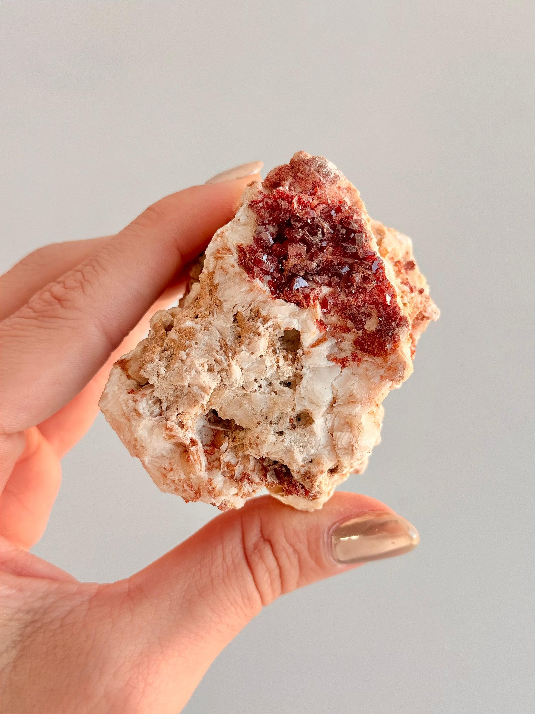 A Vanadinita é um cristal fascinante, conhecido por seus tons vibrantes de vermelho, laranja e marrom, que lembram pequenas chamas cristalizadas. Pertencente ao grupo dos minerais de vanadato de chumbo, ela é encontrada principalmente no Marrocos, México e EUA, e se destaca por sua aparência geométrica em cristais hexagonais bem definidos e altamente energéticos.