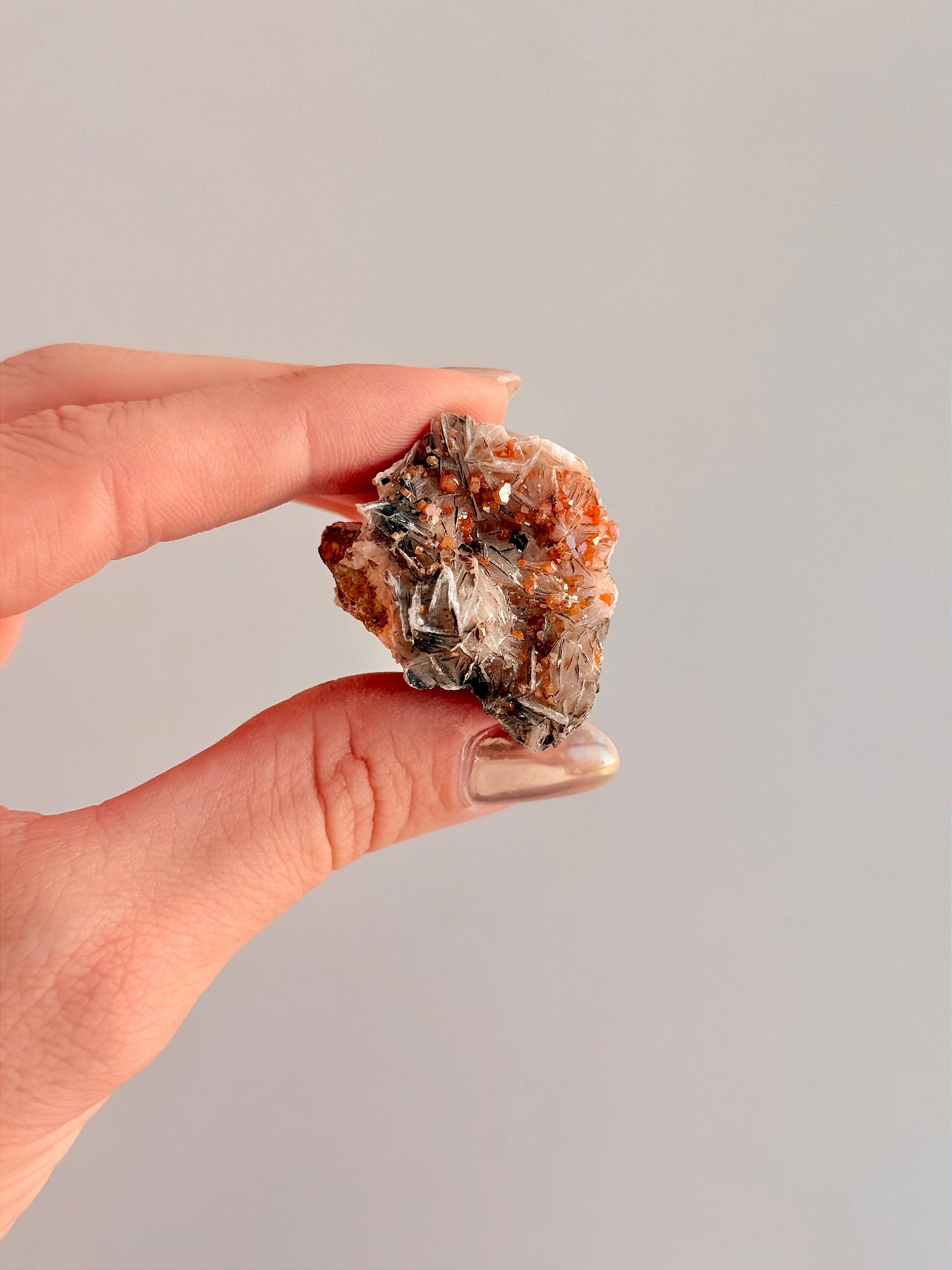 A Vanadinita é um cristal fascinante, conhecido por seus tons vibrantes de vermelho, laranja e marrom, que lembram pequenas chamas cristalizadas. Pertencente ao grupo dos minerais de vanadato de chumbo, ela é encontrada principalmente no Marrocos, México e EUA, e se destaca por sua aparência geométrica em cristais hexagonais bem definidos e altamente energéticos.