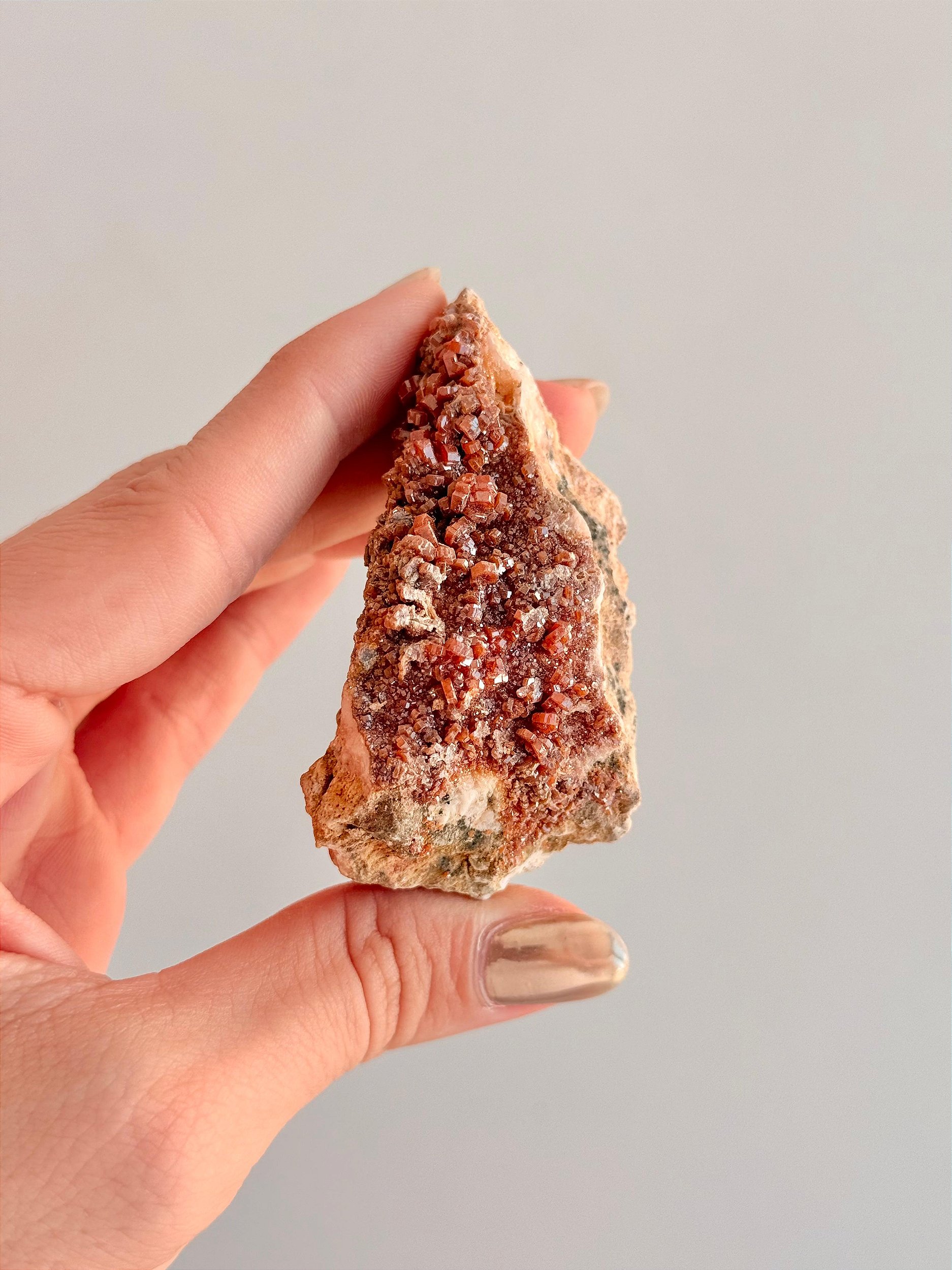 A Vanadinita é um cristal fascinante, conhecido por seus tons vibrantes de vermelho, laranja e marrom, que lembram pequenas chamas cristalizadas. Pertencente ao grupo dos minerais de vanadato de chumbo, ela é encontrada principalmente no Marrocos, México e EUA, e se destaca por sua aparência geométrica em cristais hexagonais bem definidos e altamente energéticos.