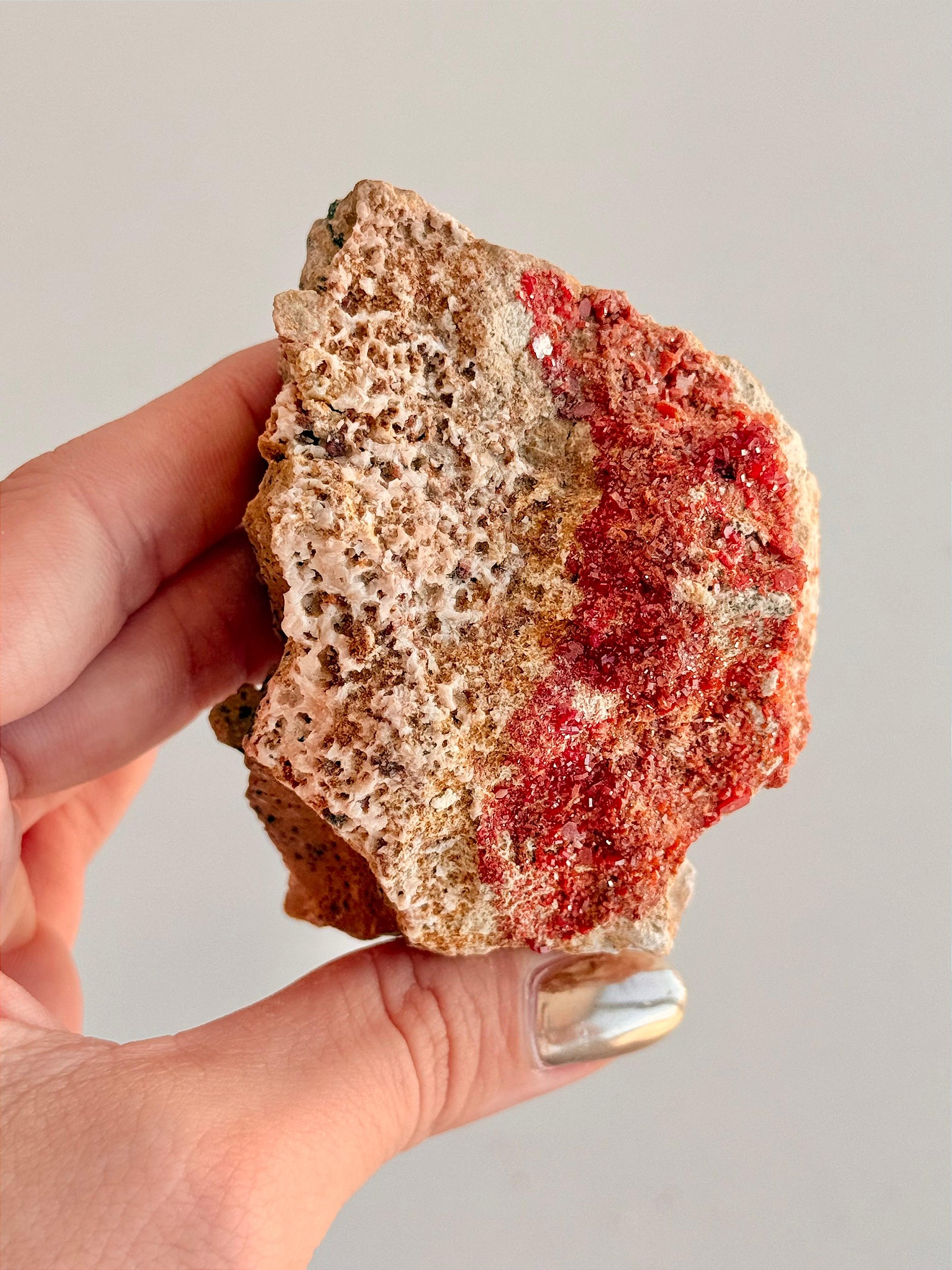 A Vanadinita é um cristal fascinante, conhecido por seus tons vibrantes de vermelho, laranja e marrom, que lembram pequenas chamas cristalizadas. Pertencente ao grupo dos minerais de vanadato de chumbo, ela é encontrada principalmente no Marrocos, México e EUA, e se destaca por sua aparência geométrica em cristais hexagonais bem definidos e altamente energéticos.