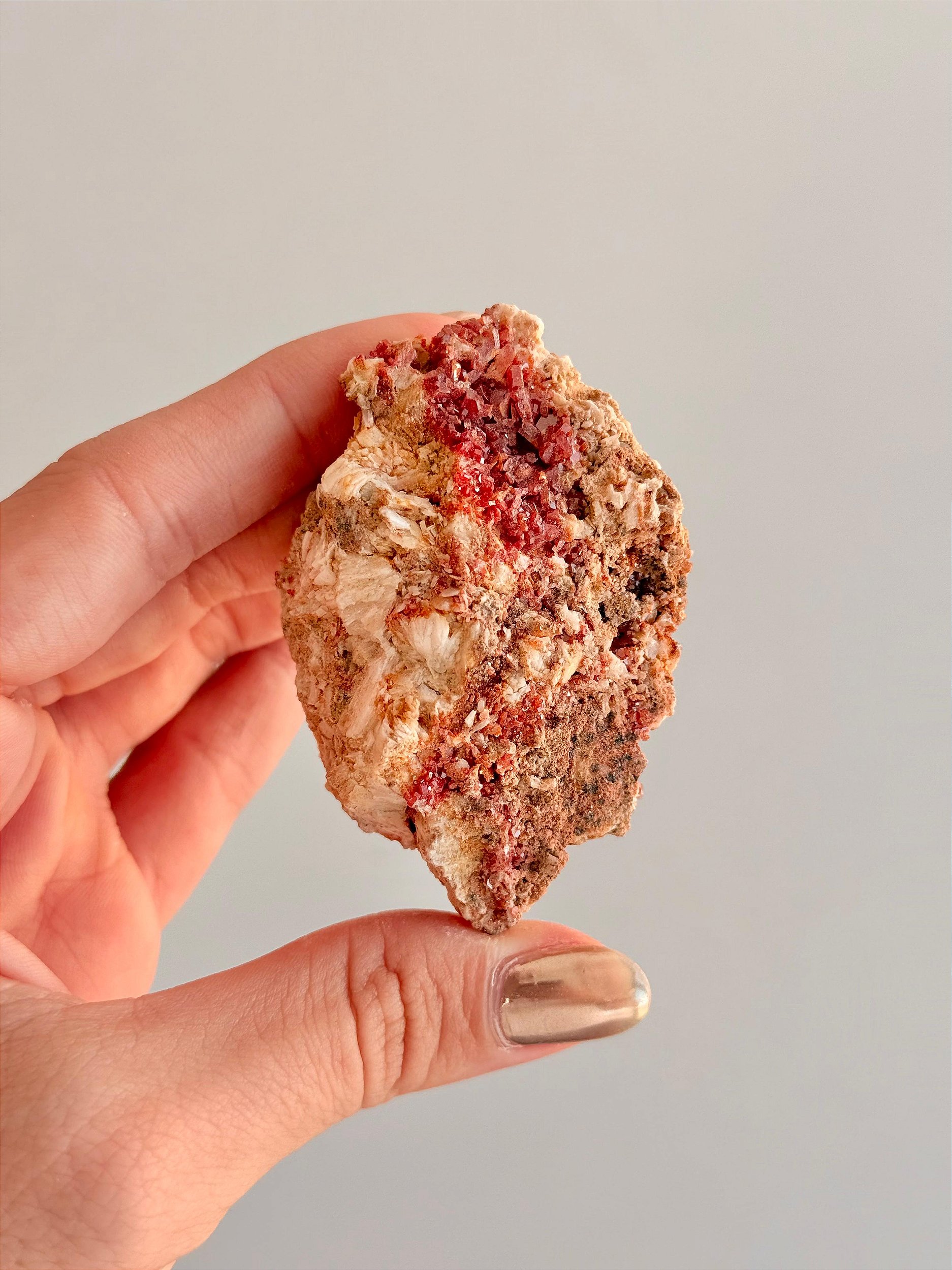 A Vanadinita é um cristal fascinante, conhecido por seus tons vibrantes de vermelho, laranja e marrom, que lembram pequenas chamas cristalizadas. Pertencente ao grupo dos minerais de vanadato de chumbo, ela é encontrada principalmente no Marrocos, México e EUA, e se destaca por sua aparência geométrica em cristais hexagonais bem definidos e altamente energéticos.