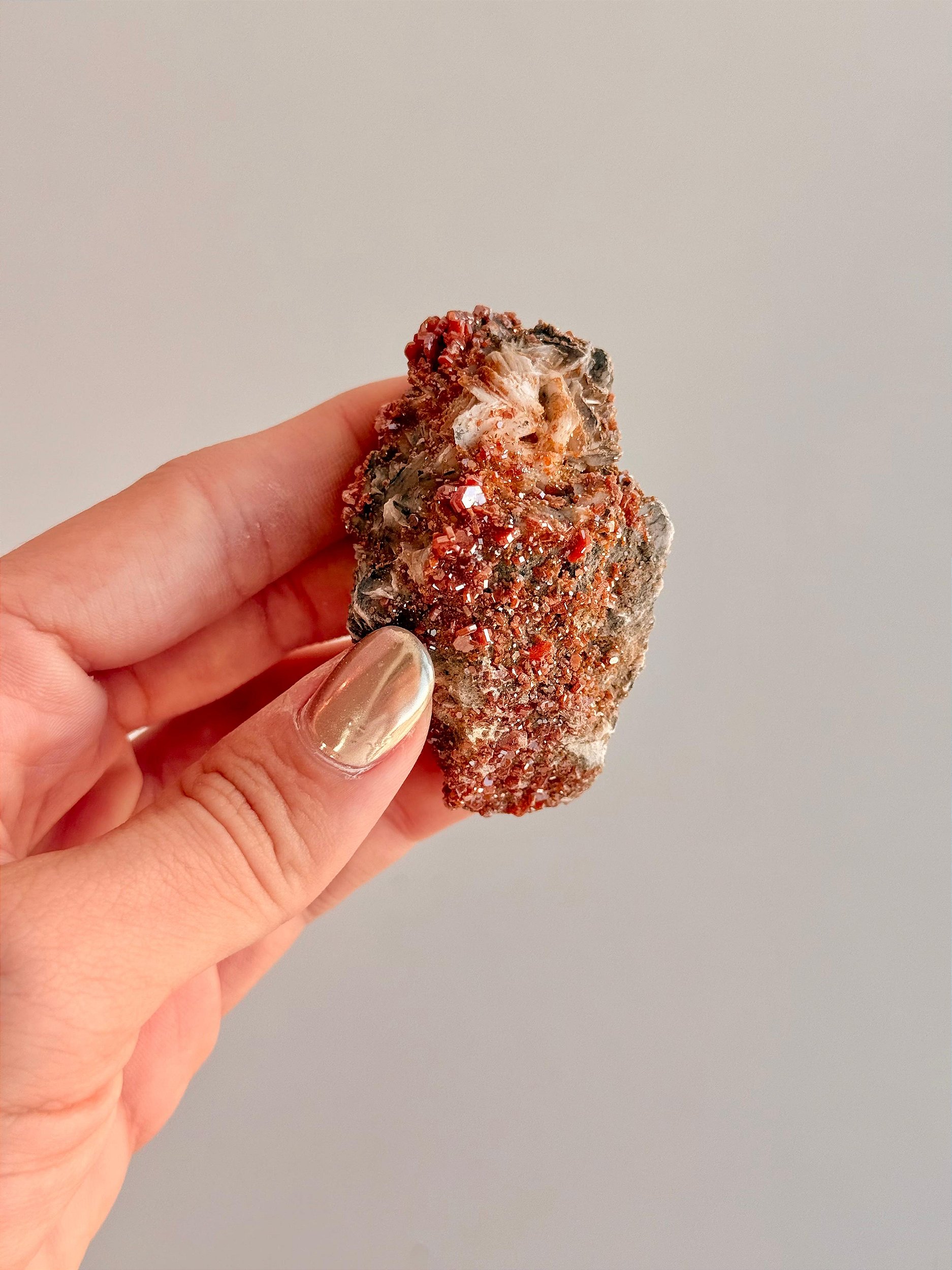 A Vanadinita é um cristal fascinante, conhecido por seus tons vibrantes de vermelho, laranja e marrom, que lembram pequenas chamas cristalizadas. Pertencente ao grupo dos minerais de vanadato de chumbo, ela é encontrada principalmente no Marrocos, México e EUA, e se destaca por sua aparência geométrica em cristais hexagonais bem definidos e altamente energéticos.