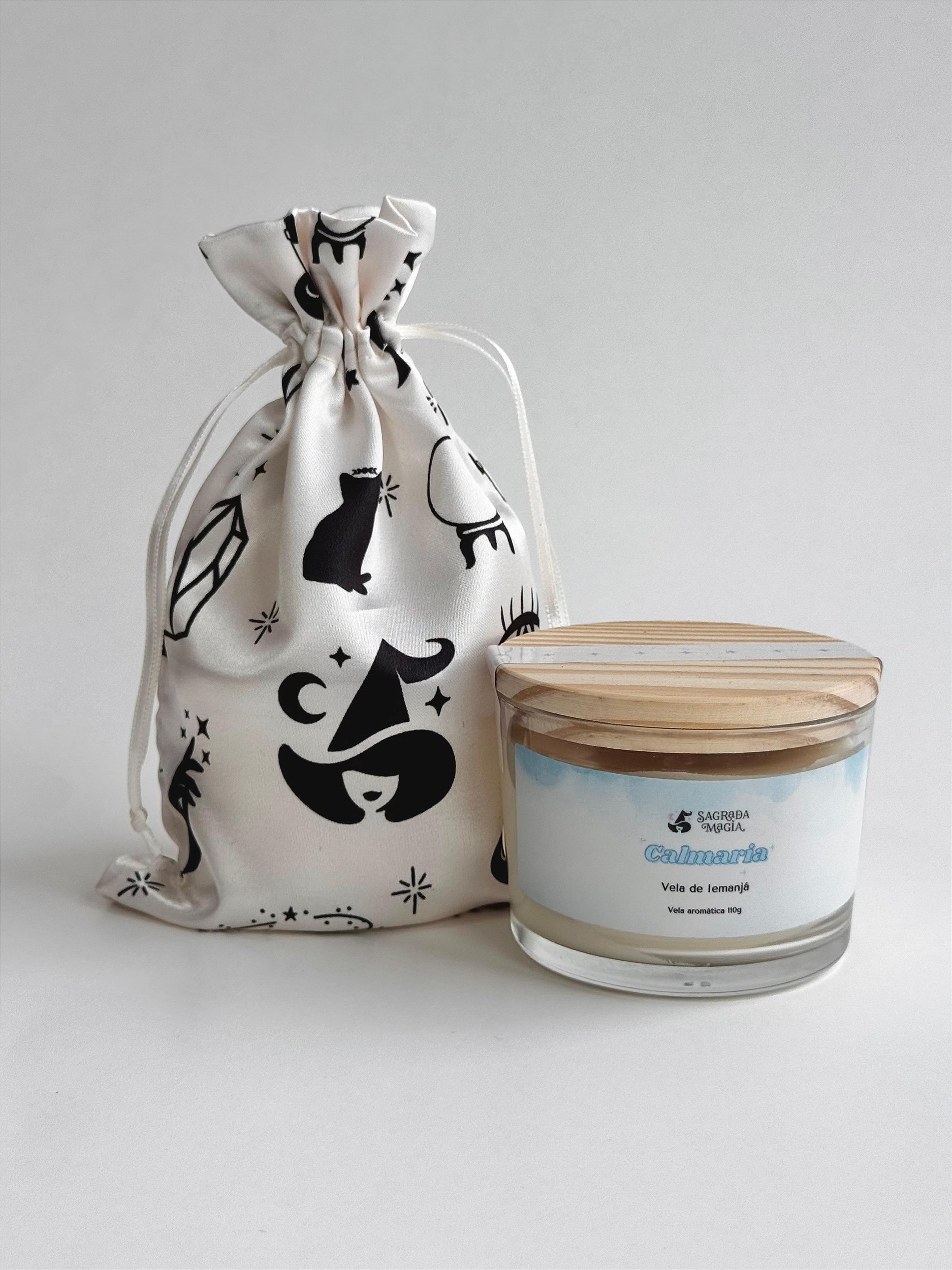 Contém 01 vela aromática de 110g e 01 saquinho de cetim personalizado.